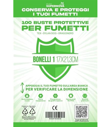 Compra MC DAISON 100 pezzi Busta bustina copertina richiudibile 17 x 21,3 cm per fumetti Bonelli Tex (dal n.121 in poi), Zagor, Mister No, Comandante Mark (17,6 x 21,3 + 3 per Bonelli Speciale Almanacco). SPEDIZIONE GRATUITA su ordini idonei. Passa a. Con DESCRIZIONE variante 17 x 21,3: questa busta è adatta a contenere TEX dal n. Queste buste sono perfette per questi fumetti: Fumetti Bonelli SPECIALE Bonelli bimestrali da 164 pagine TEX primi 120 numeri TEX con supplemento Bonelli TEX almanacco DYLAN DOG speciale EDIZIONI IF: Diabolik il mito, MIKI, BLEK, Martin Mystere… Caratteristiche tecniche Quantità: 100 pezzi Dimensioni: 176 x 213 mm + 30 mm linguella richiudibile Materiale: polipropilene lucido a specchio Spessore: 30my Prodotto rigorosamente MADE IN ITALY Bellissime buste per fumetti in polipropilene lucido trasparente effetto “a specchio” con linguella adesiva richiudibile. DESCRIZIONE variante 17,6 x 21,3: questa busta è adatta a contenere fumetti Bonelli TEX i primi 120 numeri, TEX con supplemento Bonelli, TEX almanacco, DYLAN DOG speciale, EDIZIONI IF di Diabolik il Mito, MIKI, BLEK, Martin Mystere Tex Copertine MC DAISON 100 Pezzi Busta Bustina Copertina Richiudibile 17,6 X 26,5 +3 Cm Per Fumetti COMICS SUPEREROI (Spiderman Uomo Ragno, X-Men, Spawn, Superman, Batman…) Made In Italy Mc Book PRESENTAZIONE: 100 PEZZI busta protettiva lucida richiudibile per fumetti BONELLI
