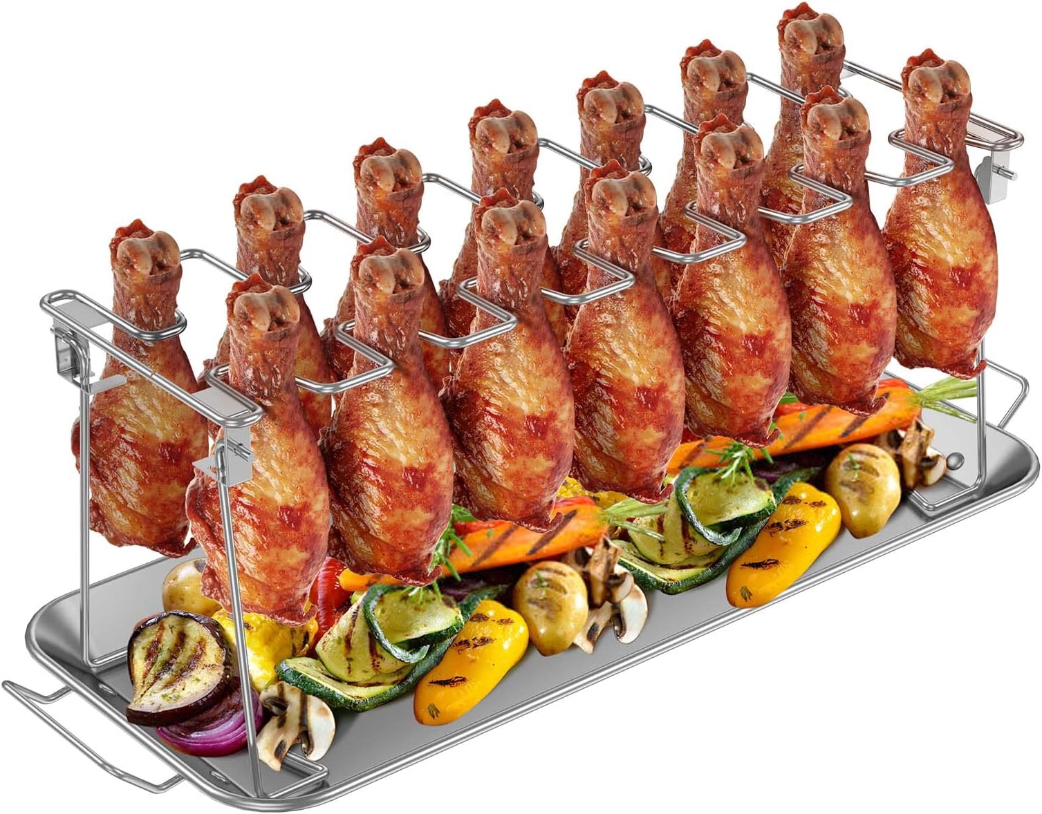 Cosce Di Pollo Supporto Weber Griglia Di Espansione 7617 Supporto Pollo Per Forno Fino a 14 cosce di pollo trovano spazio contemporaneamente nel supporto e la ciotola può essere utilizzata sia come vassoio antigoccia per grasso in eccesso e succo di arrosto o per la preparazione parallela di verdure grigliate. La griglia per cosce di pollo di Westmark permette di preparare facilmente le ali di pollo sulla griglia o in forno. La rastrelliera può contenere fino a 14 cosce di pollo alla volta e il vassoio può essere utilizzato sia come sgocciolatoio per il grasso In questo modo gli amanti della carne e i vegetariani possono preparare deliziosi piatti alla griglia. SALVASPAZIO – Il telaio in acciaio inox del portapollo può essere ripiegato per risparmiare spazio. FACILE DA PULIRE – Il supporto della griglia è lavabile in lavastoviglie, rendendo la pulizia un gioco da ragazzi. PULITO – Il supporto per cosce di pollo può cuocere fino a 14 cosce di pollo contemporaneamente, risparmiando tempo e garantendo una cottura uniforme. Dopo il lavoro, il telaio può essere smontato nelle sue parti, lavabile in lavastoviglie e poi riposto risparmiando spazio.