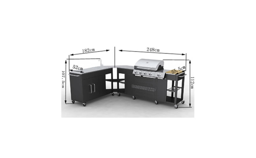 Contatore con griglia, dimensioni: 248 x 55,5 x 112 cm (L x P x H). Numero di pulsanti di controllo: 5. Numero di ruote: 12. Descrizione. VidaXL 40428. Fattore di forma: Zona cottura, Colore del prodotto: Nero, Acciaio inossidabile, Forma zona cottura: Rettangolare Bbq A Gas VIDAXL - 40428, Zona Cottura, Nero, Acciaio Inossidabile Bbq Gas