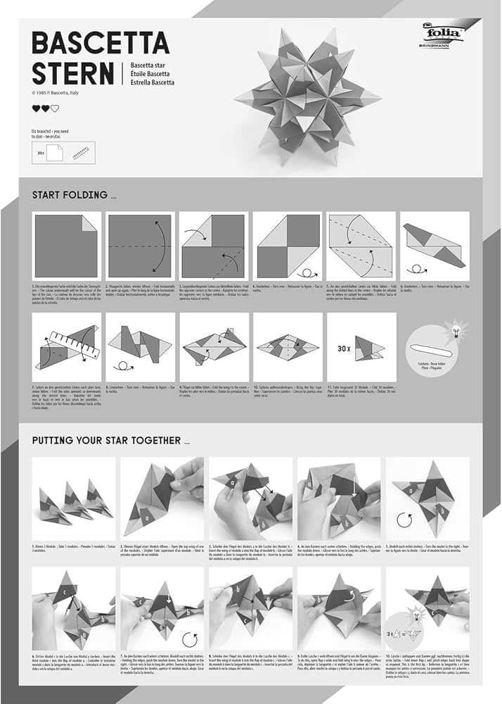 Colori Da folia è possibile trovare un’ampia paletta di colori variopinti per dipingere, colorare, scrivere, decorare e molto altro ancora. L'ampia gamma di colori e dimensioni è una vera gioia per tutti gli appassionati di bricolage ed è in grado di soddisfare qualsiasi desiderio. Ufficio e disegno folia offre prodotti utili per la scrivania e il lavoro in ufficio. Da folia sarà possibile trovare tutto quello che serve, dalla carta da regalo ai set creativi. Contenuto: 32 fogli di carta artigianale, circa 15 x 15 cm, 90 g/m² A tal fine folia propone articoli da colorare e da realizzare con le proprie mani e soluzioni complete contenenti tutto quello che può servire. Motivi creativi, materiali diversi, semplicità d’uso e la più alta qualità sono ciò che rende unici i prodotti folia e che assicura il piacere di realizzare creazioni con le proprie mani. Utensili Chi vuole dare libero sfogo alla propria creatività come si deve non può fare a meno dell'ampia scelta di utensili da bricolage folia. Lanterne e luci Le luci e i giochi di luce sono perfetti per creare una piacevole atmosfera soffusa e accogliente in casa propria. Elementi decorativi Il bricolage si compone di numerosi piccoli passi in ciascuno dei quali si utilizzano materiali e prodotti diversi. Da folia è possibile trovare numerosi biglietti di diversi formati: doppi, pop-up 3D, passe-partout, a fisarmonica o di design già pronti. Con l'ampia offerta di articoli folia, dal block notes alle cartelline portadocumenti, dai raccoglitori ai fogli trasparenti ai planner da scrivania e ai cartoncini per schedario, tenere in ordine la scrivania è un gioco da ragazzi. Folia 402/1515 Craft Set Bascetta Star Winter Ornament White/Ice Un team di esperti sviluppatori di prodotto e trend scout si assicura di soddisfare ogni possibile richiesta. Con istruzioni dettagliate e illustrate (lingua italiana non garantita) Il brand offre tutto quello che serve per i progetti creativi: stampi a tema, forbici, piani da taglio, colle, piegacarta, righe e molto altro ancora. Decorazione invernale tridimensionale per origami bianco/blu ghiaccio Il brand L'azienda Max Bringmann KG, con la marca folia, esiste dal 1965: quella che è iniziata quale azienda per la produzione di articoli di pellicola di alluminio per il settore del bricolage è diventata un'impresa attiva a livello non solo europeo ma internazionale.