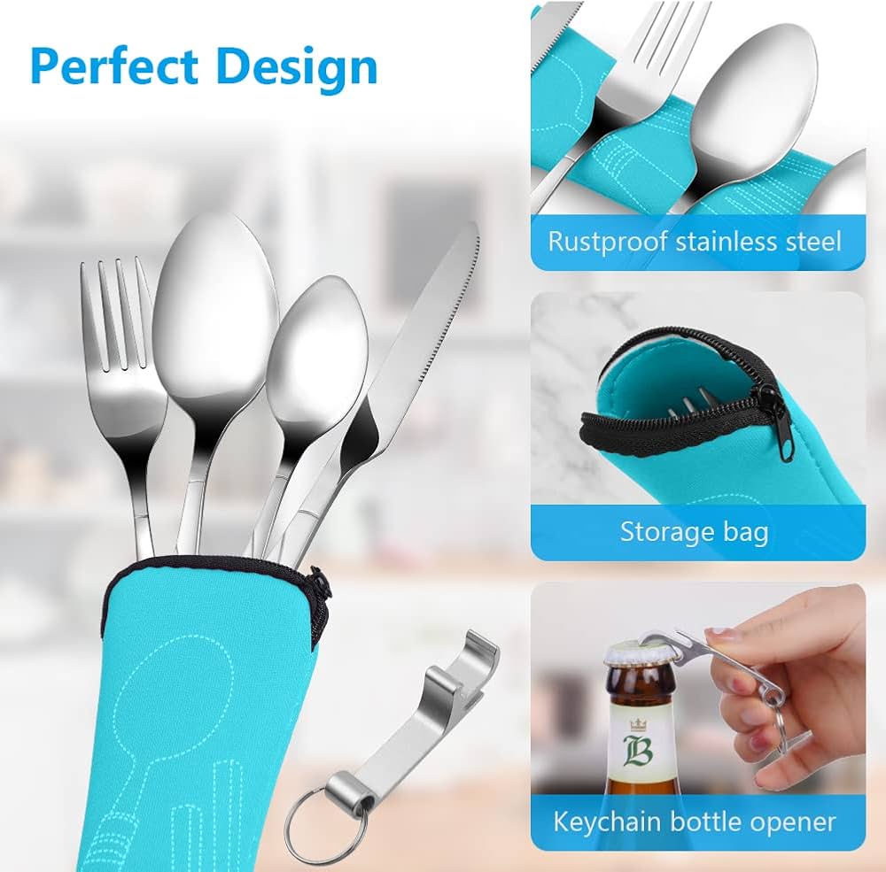 Vicloon Set Di Posate Con Custodia Portatile, 5 Pezzi In Acciaio Inossidabile Con Apribottiglie, Da Viaggio Coltello Forchetta Cucchiaio Per Campeggio (Verde
