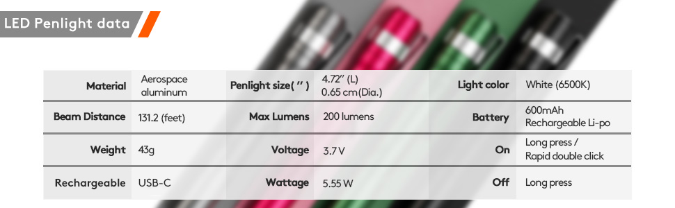 Una nuova svolta: Max. Nitecore MT06MD Latarka Długopisowa RovyVon Aurora A33 Gunmetal O Light Pen Cinque impostazioni di luminosità: premere a lungo per accendere il chiaro di luna (design per le luci a penna medicali), fare clic per passare dalla luce della luna (0,8 lm) - bassa (15 lm) - media (60 lm) - alta (200 lm). Semplice interruttore posteriore: questo design a pulsante sarebbe il design più semplice con una sola mano tra tutte le tue torce Aurora. The Aurora A33 is a tail switch pen light with optional max output of 200 lumens or at least 90+ CRI LED. A 600mAh rechargeable battery supports a long runtime at the lowest brightness. A deep carry pocket clip makes it an easy-carry EDC flashlight as wel Raggio di 40 m, impermeabile IPX8, lats fino a 56 ore in modalità chiaro di luna. Una nuova innovazione: Max 200 lumen, a differenza di altre penne sul mercato, questa torcia a LED A33 non ha bisogno di batterie e non si dimetterà mai. RovyVon Aurora A33 Torcia tascabile ricaricabile USB-C con clip tascabile, 200 lumen, IPX8 impermeabile per ispezione, riparazione, lavoro, all'aperto. Cinque impostazioni di luminosità: premere a lungo per accendere da Moonlight (design per penne mediche), fare clic per scorrere attraverso Moonlight (0,8 lm) -Low (15 lm) -Med (60 lm) -High(200 lm). Un regalo ideale per nonna, nonno, madre, padre e amici. 40 m, impermeabile IPX8, durata della luce fino a 56 ore in modalità chiaro di luna. 200 lumen, a differenza di altre torce a penna sul mercato, questo A33 non richiede batterie e non rinuncerà mai allo spirito. Bel fascio circolare: ideale per tutti i tuoi scopi quotidiani, ad esempio per ispezioni sotto un lavello da cucina o un lavabo da bagno, e non disturba la visione periferica delle persone nelle vicinanze quando lo si utilizza all'aperto. Ricarica USB-C e di lunga durata: questa torcia A33 è progettata per soddisfare le tue esigenze di ricarica di tipo C. Viene fornito con una clip da tasca che ti consente di fissarlo alla borsa o alla cintura. Dotato di batteria ricaricabile da 600 mAh, funziona fino a 56 ore al chiaro di luna, 14 ore per basso, 4,5 ore per medio, 1 ora per alto. Semplice interruttore di coda: questo design del pulsante sarebbe il design con una sola mano più semplice tra tutte le torce rovyvon.