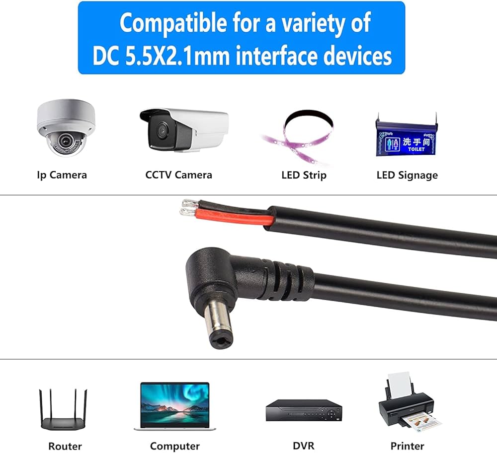 Connettore A: DC 5,5 mm x 2,5 mm, spina DC 90 gradi. Connettore B: DC 5.5mm x 2.5mm 90 gradi DC maschio La confezione include: 2 x DC5525 90 gradi maschio maschio cavo a molla. E per proteggere il connettore di alimentazione CC del dispositivo dai danni causati da frequenti accensione/spegnimento Tensione: 12 V. Corrente: 1,5 A. Compra GINTOOYUN Cavo di prolunga DC 5,5 mm x 2,5 mm, spina a 90 gradi, ad angolo retto, DC5525, per strisce Lihgt, CCTVsecurity, monitor, ecc. (2 pezzi). SPEDIZIONE GRATUITA su ordini idonei Prolunga Filo Piatto GINTOOYUN Cavo Di Prolunga DC 5,5 Mm X 2,5 Mm, 18 AWG DC5525 90 Gradi Cavo Alimentazione Prolunga Dc Il cavo di prolunga di alimentazione DC 5525 maschio a spina rettangolare è adatto a qualsiasi dispositivo che richiede un alimentatore con un connettore da 2,5 mm x 5,5 mm per estendere o sostituire un cavo di alimentazione danneggiato. La corrente di carico massima non supera i 2 A. Lunghezza cavo: 25 cm/stretch:80 cm. Ampiamente usato in apparecchiature 0-12 V, come telecamere di sorveglianza, luci a LED con stampanti per apparecchiature di sorveglianza. Cavo di alimentazione DC 5,5 mm × 2,5 mm, spina a 90 gradi, ad angolo retto DC5525, ampiamente utilizzato in attrezzature da 0 – 12 V come strisce LED, telecamere di sorveglianza CCTV, automobili, ecc.
