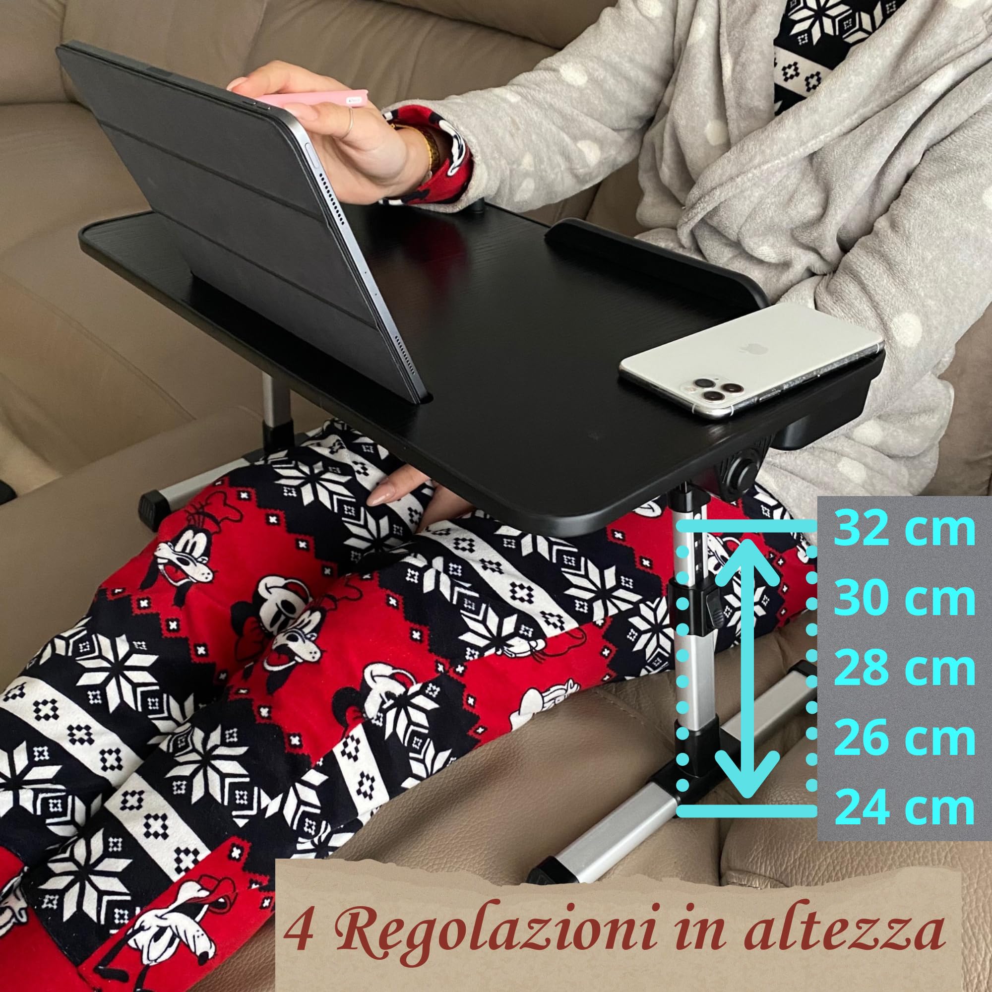 INCLUSA SEDE PER PASTIGLIA CASSETTO PORTAOGGETTI INCLUSO FACILE DA PIEGARE Non perdere l'occasione di migliorare il tuo comfort quotidiano. Perché Sceglierci? Facilità di UsoIl nostro tavolino pc da letto è facile da montare e da regolare, offrendo la massima praticità in ogni situazione. Garanzia Di Reso: Non preoccuparti se decidi che non è il tavolo da letto giusto o la dimensione giusta per te, riceverai un rimborso completo entro 30 giorni dall'acquisto. Materiale: Legno e metallo Colore: Nero Peso: 2.5 kg A differenza delle versioni più economiche, il nostro tavolo pieghevole per computer con un design accattivante e moderno si adatta alla tua casa, è robusto, facile da riporre e pulire. Qualità Premium Realizzato con materiali di alta qualità, questo tavolino portatile è robusto e durevole, assicurando una lunga durata e resistenza nel tempo. *La garanzia di fabbrica è disponibile solo tramite venditori autorizzati. Caratteristiche Principali Versatilità senza paragoni Utilizza il nostro tavolino da letto per ogni tua esigenza. Stabile, Solido, Qualità: tavolino colazione a letto con una base stabile e robusta per evitare movimenti e vibrazioni che possono danneggiare i dispositivi elettronici. Ottimo Regalo: la scrivania per laptop può essere il miglior regalo per compleanni, Natale, amici, genitori, sorelle, fratelli, ogni occasione è perfetta per regalare questo prodotto e rendere felice una persona cara. Tavolo da divano: Perfetto anche come supporto accanto al divano per snack o bevande. che lo darai, puoi regolare facilmente l'angolo a seconda delle necessità in ogni momento 0°/15°/25°/36° Prova il nostro tavolino da letto e scopri la comodità e la versatilità che solo un prodotto di qualità può offrire. Tavolino Letto DLS | Tavolino Da Letto Per PC E Vassoio | Supporto PC Portatile Per Letto, Divano, Pavimento | Per Bambini, Adulti, Mangiare Tavolino Da Letto Pc Utilizzi Multipli Scrivania da letto: Trasforma il tuo letto in un'area di lavoro confortevole. Ideale per l'uso a casa, ospedale, hotel, campeggio, spiaggia, come vassoio per la colazione a letto o come mini tavolo in base alle proprie esigenze. La portabilità è un vantaggio fondamentale per i clienti che desiderano un tavolino per letto facile da spostare e non occupa troppo spazio. Design Elegante Con un design moderno e sofisticato, questo tavolo da letto per pc si integra perfettamente in qualsiasi arredamento, aggiungendo un tocco di stile al tuo spazio.