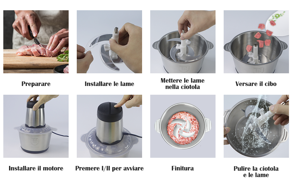 tritacarne elettrico 2l contenitore verdure multifunzione Facile da usare: basta inserire gli ingredienti nel contenitore, collegare l'alimentazione, premere il pulsante e la macchina inizierà automaticamente a schiacciare la carne, che può essere facilmente azionata anche dagli anziani. Alta efficienza: il prodotto è dotato di un motore rotore in rame da 300 W, velocità di circa 10000 rpm e lame affilate per consentire una frantumazione rapida e fluida. Durevole: il prodotto è realizzato principalmente in PET e acciaio inossidabile di alta qualità, con alta resistenza, resistenza al calore e resistenza all'usura, ed è sicuro da usare. Protezione di sicurezza: i nostri prodotti hanno una funzione di protezione contro il surriscaldamento, la macchina si spegne automaticamente quando l'apertura di riempimento viene aperta per evitare lesioni accidentali, il che può migliorare efficacemente la sicurezza durante l'uso. Frullatore Tritatutto Multifunzione Tritatutto Da 5 L, 300 W, Tritacarne, Tritacarne Multiuso Tritatutto Elettrico La grande capacità di 1,32 g può contenere più ingredienti contemporaneamente, aumentando l'efficienza e soddisfare le esigenze di tutta la famiglia.