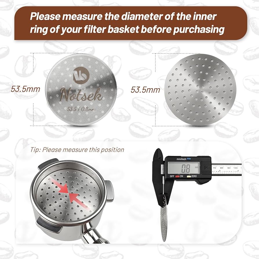 Buona estrazione: l'uso dello schermo a disco da 54 mm evita una parziale sovraestrazione o sottoestrazione, aiuta a distribuire uniformemente il sapore e rende più fluidi i colpi di espresso. I fori più piccoli rivolti verso il basso garantiscono un'estrazione più uniforme del caffè, riducendo l'effetto di canalizzazione. Filtro Ecov311 MICXNIC Schermo A Disco Da 54 Mm, Sottile 0,8 Mm, Riutilizzabile Sage Macchina Caffe La sua proprietà facile da pulire tiene a bada oli e residui di caffè. I grandi fori rivolti verso l'alto consentono all'acqua di fluire nei fondi di caffè più velocemente e in modo più uniforme durante la preparazione. Questo non solo garantisce un gusto puro del caffè, ma previene anche efficacemente l'intasamento della testa di erogazione, mantenendola pulita e in buone condizioni. Questo articolo: NOTSEK Schermo a disco da 54 mm, per portafiltro da 54 mm, con scatola in acrilico, riutilizzabile, spessore 1,7 mm, 150 μm, acciaio inossidabile 316L, schermo filtro caffè, schermo doccia inferiore. Venduto da NOTSEK EU e spedito mediant Privo di lisciviazione di metalli pesanti, goditi ogni tazza da caffè senza preoccupazioni. Puoi utilizzare appieno i fondi di caffè per creare un caffè ricco e morbido. Un consiglio: lo schermo a disco è metallico, si prega di lasciarlo raffreddare prima di rimuoverlo per evitare ustioni.