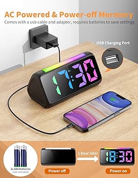 【8 Suonerie】 8 suonerie per la sveglia, il cui volume può essere regolato con un dimmer. 【2 Allarmi e funzione Snooze】Due allarmi indipendenti, ciascuno con funzione snooze. LIORQUE Sveglia Digitale da Comodino, Sveglia da Comodino a LED a Colori con Funzione Snooze, Sveglia Digitale con Temperatura, Luminosità 0-100%, 8 Suonerie, 2 Allarmi, Porta di Ricarica USB, Nero. [2 Allarmi e funzione Snooze]Due allarmi indipendenti, ciascuno con funzione snooze Sveglia Con Proiettore Soffitto CHEREEKI , LED Sveglia Da Comodino Con Temperatura/Snooze/ 2 Allarme/12/24 Ore/Porta Di Ricarica USB/10 Musiche Sveglia Digitale 【Visualizzazione Della Temperatura】 Supporta la conversione dell'unità di misura della temperatura tra Celsius (℃) e Fahrenheit (℉), con la possibilità di cambiare premendo il pulsante specificato. La manopola dimmer rotante consente di regolare facilmente la luminosità in base al livello di comfort preferito, con un intervallo di regolazione compreso tra 0% e 100%. Quando suona la sveglia del mattino, è possibile premere il pulsante snooze e godersi 10 minuti di sonno in più. 【Opzioni di alimentazione doppia】 Alimentazione a cavo o a batteria, due opzioni. Che si tratti di bambini, adulti o anziani, è facile da usare grazie al suo semplice programma di configurazione.