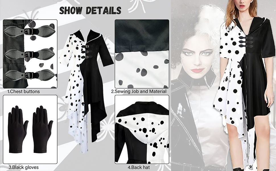 【Eventi】Perfetto per l'abito cosplay, adatto per Halloween, contro comici, apparizioni sul palco, convenzioni, festa in maschera, giochi di ruolo, vestire, compleanno, Natale ecc. Con questo vestito puoi distinguerti dalla folla e attirare l'attenzione degli altri. Freddy Donna REIWIDE Costume Da Crudelia Deville, Costume Regina Cattiva, Vestito Da Costume Crudelia Con Cappotto 【Costume da donna Set】Un set di gonne, 1 parrucca, collana di perle, maschera di pizzo nero, 1 paio di guanti e portasigarette. Design sottile e bellissimo aspetto naturale con eccellente sensazione morbida. Devi prepararti la fascia. Questo è il costume da Crudelia De Mon, che nella versione originale, si chiamava Cruella De Vil, originale della Disney quindi ripreso da quello del film interpretato da Oscar dalla strepitosa Glenn Close. Questo abito da Crudelia ha l'introvabile cappo Il classico abito irregolare in bianco e nero ti porta nel mondo dei giochi di ruolo. 【Design unico】Non è un abito semplice, ma una giacca aperta con cappuccio, o come cappotto in stile abito. 【Consigli caldi】Tutte le parrucche sintetiche cadono leggermente, il che è normale.