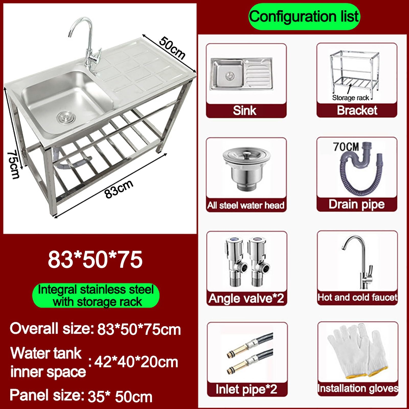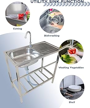 Acciaio Inox Lavello da Cucina Indipendente con Gambe & Rubinetto Lavabo Da Esterno Giardino Lavandino Commerciale Professionale per Ristorante/Garage/Lavanderia Facile Da Montare(75x40xH75cm) Marca Aumenta lo spazio di stoccaggio: i ripiani offrono ulteriore spazio di stoccaggio attorno al lavandino for pentole, padelle, prodotti for la pulizia e altri oggetti di uso frequente, rendendo la cucina più pulita e organizzata. La confezione include: 1 rubinetto singolo for l'acqua fredda, 1 tubo di scarico, 1 tubo di ingresso, 1 scolapiatti, 1 valvola angolare, 1 paio di guanti, 2 spugne for lavare i piatti, accessori for l'installazione. Design a doppio foro: design a doppio foro for rubinetto, puoi installare il lavandino a sinistra o a destra in base alle tue esigenze e abitudini. Telaio in tubo quadrato da 2,4 cm, fissaggio a vite, struttura stabile. Mobile Acciaio Inox Lavello Da Cucina Indipendente Con Gambe & Rubinetto Lavello In Acciaio Inox Materiale: il lavello da esterno è realizzato in acciaio inossidabile resistente all'usura, che può essere utilizzato a lungo e non si arrugginisce o si deforma facilmente.