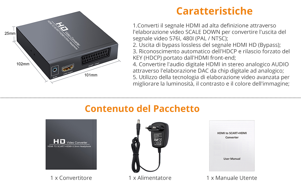 scart a hdmi hdmi adattatore scart per la tv adattatore hdmi vhs video recorder ps2 adattatore hdmi video grabberSpecifiche: Connettori di uscita: HDMI Connettori di ingresso: SCARTContenuto della consegna: 1 * Convertitore da HDMI a Scart 1 * Cavo di alimentazione USB 1 * Manuale dell'utente 【Servizio senza preoccupazioni】 offriamo una garanzia di 12 mesi e un eccellente servizio clienti per rendere il tuo acquisto senza preoccupazioni 【Convertitore da HDMI a SCART】 Questo convertitore da HDMI a SCART è un convertitore universale che converte i segnali video e audio HDMI in segnali scart compositi analogici (Nota: da Scart a HDMI non è supportato, il segnale RGB non è supportato); Dai nuova vita alle vecchie apparecchiature SZJUNXIAO Convertitore HDMI a SCART Adattatore Converter 1080P Hdmi to Scart Adattatore di Formato NTSC/PAL Video HDMI Uscita SCART per SKY HD Blu-Ray Lettore HDTV STB VHS Xbox PS4 DVD PC -Elettronica ... Si prega di notare che il nostro convertitore è l Con questo convertitore, puoi goderti una fantastica esperienza visiva con la tua famiglia Se NTSC non è supportato, impostare il convertitore su PAL. Adattatore Hdmi Scart Come Funziona Adattatore VERO Convertitore Video Da HDMI A SCART Interfaccia HDMI2SCART | EBay Videoregistratore Vhs Nuovo 【Ampia compatibilità】 Questo convertitore da ingresso HDMI a uscita Scart è ampiamente utilizzato in laptop, Sky HD box, lettore Blu-ray DVD, PS3 e altri dispositivi con porta HD HDMI (versione standard 1.3, HDCP 1.3) e offre sempre eccellenti 720P/60Hz o qualità dell'immagine HD 1080P/60Hz 【Plug and Play】 Leggero, portatile, nessun driver aggiuntivo richiesto, facile da installare e facile da usare, ideale per i principianti. 【Qualità HD stabile】 L'adattatore scart HDMI ha un connettore HDMI placcato in oro. Il convertitore è alimentato dall'adattatore di alimentazione CC 5V 1A incluso Una volta connesso, l'audio e il video sono sincronizzati e nessun ritardo.