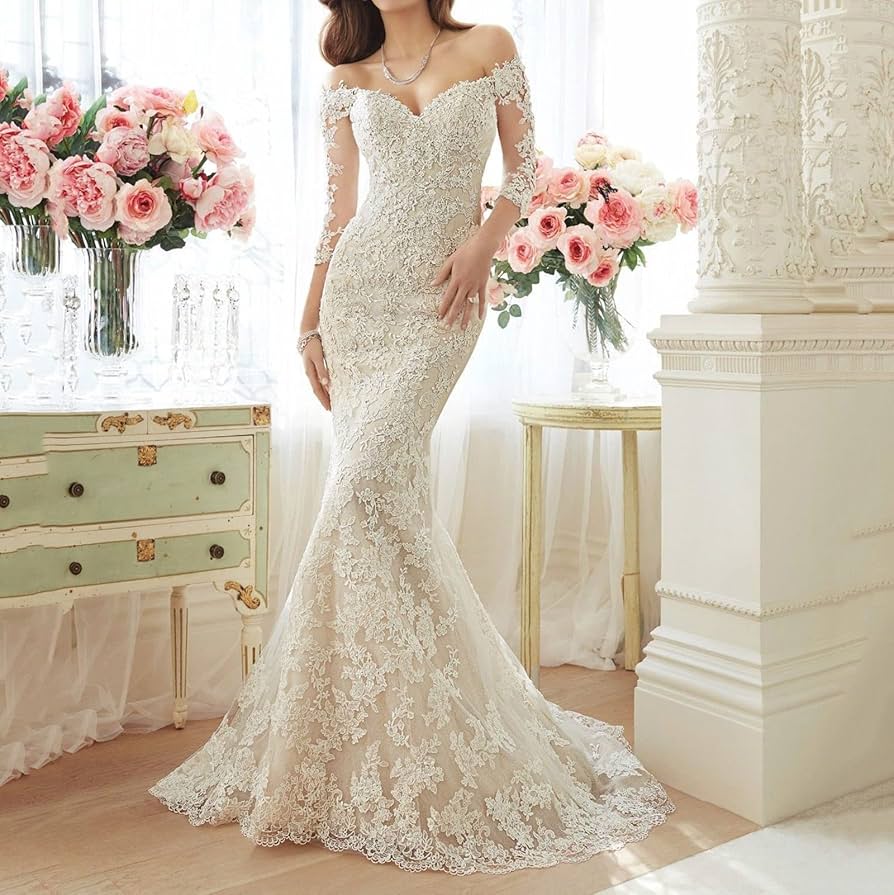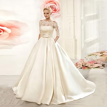 WZEFEIO Abiti Da Sposa Sirena, Pizzo Appliques Abito Da Sposa Manica Lunga Raso Abito Da Sposa Per La Sposa, Bianco, 2 : Amazon.it: Moda