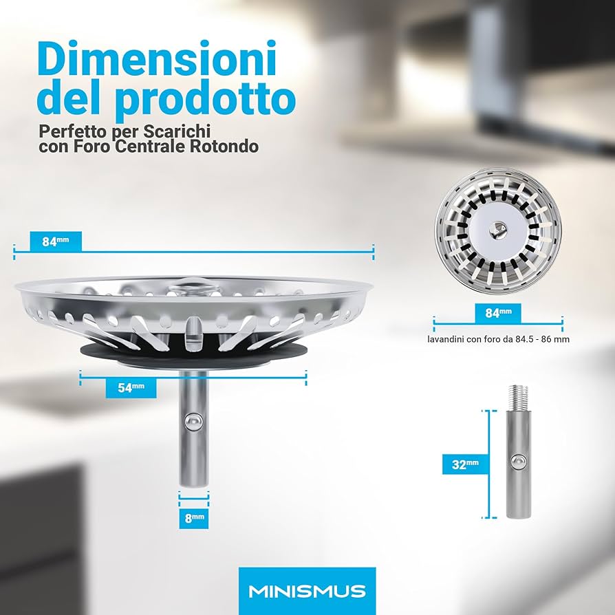 Tappo Lavandino Cucina Dachiy , Pop Up Con Filtro Scarico Universale 3 Filtro Lavandino Materiale di alta qualità: I nostri cestelli filtranti per lavello sono realizzati in acciaio inox 304 di prima qualità. Tappo pop-up per uno scarico rapido]Con il nostro tappo pop-up migliorato, puoi passare facilmente dallo stoccaggio dell'acqua al filtro di scarico rapido con una semplice pressione. Per vari ambienti, tra cui cucine, ristoranti, hotel e mense, rendendol Lo spessore aumentato del materiale garantisce resistenza alla corrosione, assenza di ruggine e una lunga durata nel tempo. Le multiple fessure garantiscono un flusso d'acqua regolare e un'efficace trattenuta dei residui alimentari. Una soluzione plug-and-play per mantenere sempre ordinato lo scarico del vostro lavello. Funzione di filtraggio: Il tappo universale da 80 mm combina chiusura e filtro integrato, ottimizzando il drenaggio. Facili da pulire e compatibili con lavastoviglie, offrono massima praticità.