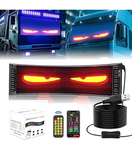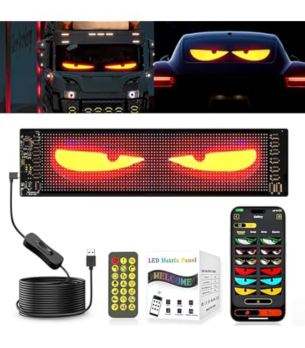 Resistente alle intemperie]: il grado di impermeabilità IP65 garantisce la durata in tutte le condizioni atmosferiche, viene fornito con un cavo da 4,5 m per un comodo utilizzo dall'interno dell'auto [Telecomando multifunzione]: usa il telecomando per passare istantaneamente tra le animazioni a tema automobilistico precaricate o le tue immagini caricate! Occhi a LED per camion, grande display flessibile programmabile, per gli occhi dell'auto, Devil Eyes Light Auto, fai da te dinamico, LED intelligente colorato per gli occhi, Soft Screen (19,2 x 89,8 [Programmabile fai-da-te]: utilizzo di una matrice LED flessibile di fascia alta accoppiata con circuiti programmabili racchiusi in un polimero adesivo flessibile impermeabile IP68. Ti permette di schiaffeggiarlo ovunque e staccarlo facilmente in qualsiasi momento senza sporcare. Specifiche del prodottoSpessore: 2 cmPeso: 485 gAlimentazione: alimentato tramite USBTipo di schermo: schermo morbidoGrado di impermeabilità: IP65Opzioni di controllo: controllo tramite app mobile, telecomando con cavo da 4,5 m (14,7 piedi). [Personalizzazione tramite APP]: sblocca tutte le funzionalità per la massima personalizzazione connettendoti facilmente tramite Bluetooth utilizzando l'app sul tuo telefono. Alimentato tramite USB, compatibile con caricabatterie per auto e power bank Fai risaltare la tua auto oggi! Perfetto per tutti gli appassionati di auto che desiderano fare una dichiarazione audace sulla strada! Aggiungi un tocco di personalità e divertimento al tuo veicolo con lo schermo morbido della lampada colorata per gli occhi. Occhi Luminosi Per Automobili Yeux LED Devil Eyes Pour Camion Et Voiture, écran Souple, Programmable (120 X 595 Mm Occhi Luminosi Per Camion