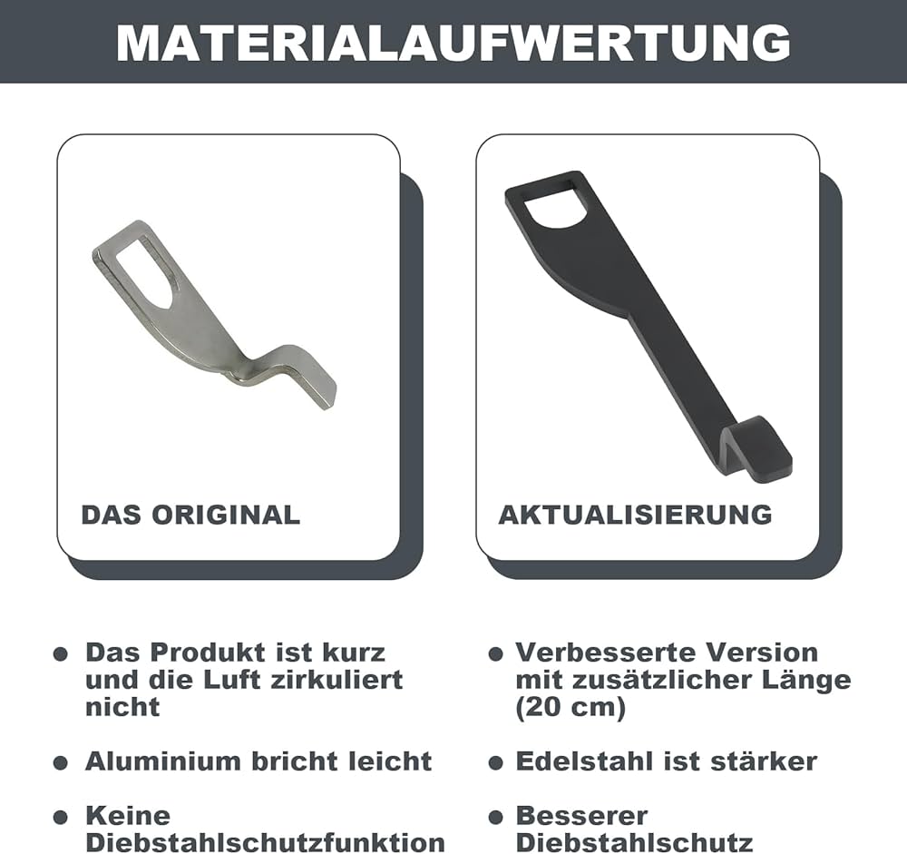 Materiale: acciaio inossidabile Colore: argento per 20CM Non utilizzare il supporto del portellone durante la guida o quando si aziona un riscaldatore ausiliario o ausiliario da fermo, poiché in circostanze sfavorevoli i gas di scarico potrebbero entrare nel veicolo attraverso il portellone aperto. 040 Delen Lange Achterklep Display 20 Cm VW T6, T5, T4 California Beach compatibile con la California Compatibile con Multivan Compatibile con Hyundai H1 Compatibile con Proace City Compatibile con Transit Custom Bus 2012/04-2019/12 Compatibile con Transit Custom box 2012/04-2019/12 Compatibile con corriere Ford Tourneo Compatibile con W639 2003/09-2013/12 Compatibile con Primastar Bus 2001/03-2009/12 compatibile con scatola Primastar 2002/09-2014/12 compatibile con Evalia Compatibile con Opel Vivaro Combi 2014/06-2019/12 Compatibile con Opel Vivaro Combi J7 2001/08-2014/12 Compatibile con Opel Vivaro Box 2014/06-2019/12 Non adatto per veicoli con portellone elettrico. La piccola fessura di apertura impedisce l'accesso dall'esterno all'interno. Il contenuto della confezione include: 1 x staffa per portellone posteriore, distanziatore per portellone, gancio di prolunga per aria fresca nel bagagliaio EXTRA LUNGO: La lunghezza extra consente allaria fresca di circolare particolarmente bene, anche con coperchi del bagagliaio spessi come VW T6 e VW T5. PERICOLO! NON compatibile con VW T6 T5 Transporter!, A PROVA DI FURTO: il gancio rinforzato in acciaio Con l'aiuto di questo display del portellone, il portellone del veicolo rimane aperto di circa 10 cm e serve quindi a ventilare l'interno del veicolo. Ciò non pregiudica la chiusura del portellone. Compatibile con il modello T4 T5 T6 con portellone (non compatibile con porte ad ali di gabbiano!)