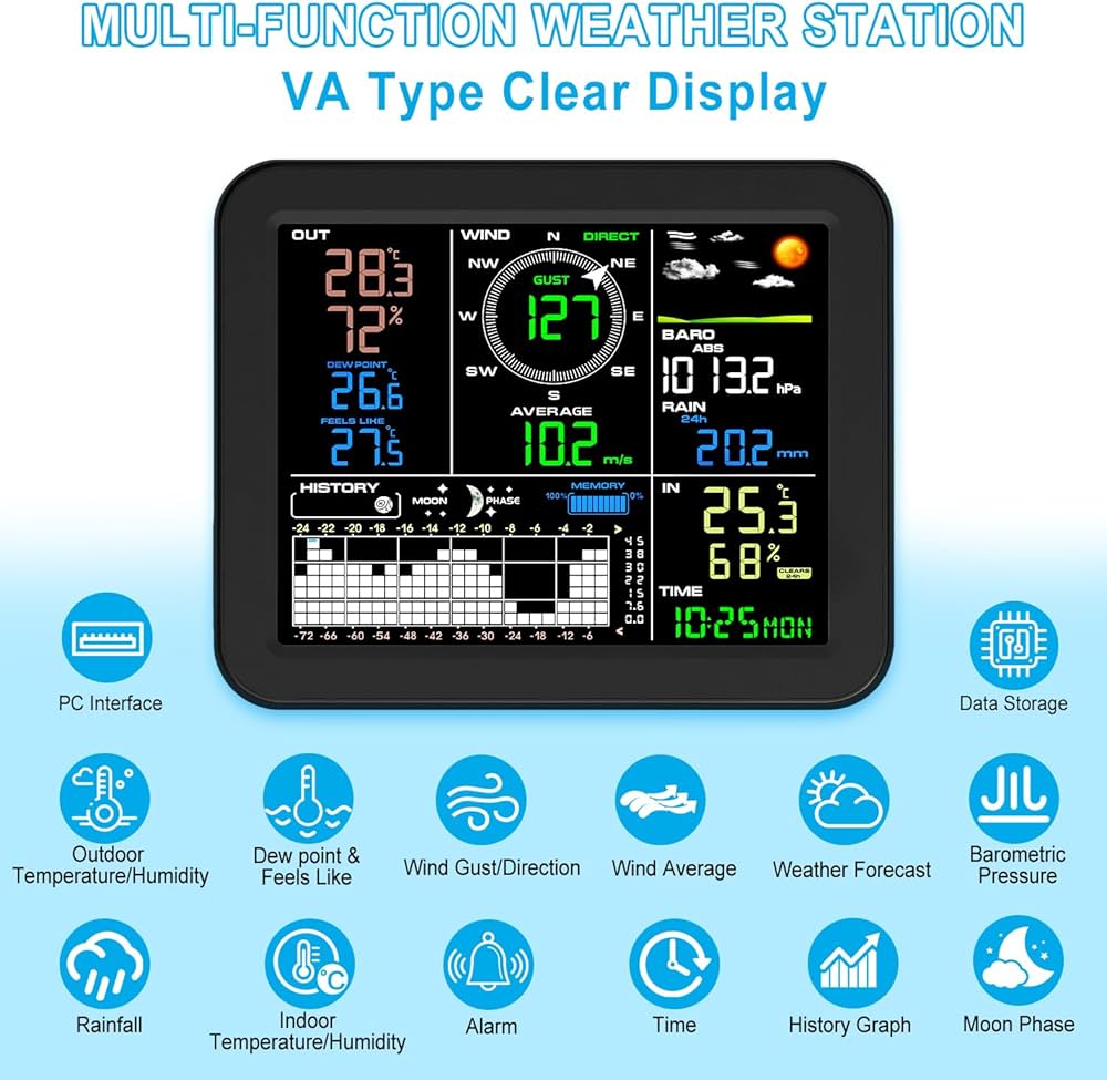 Uzoli Stazione Meteo Con Pluviometro Anemometro Display A Colori 7,4'' Temperatura Interna Esterna Umidità Pressione Dell'aria Previsioni Meteo 6 In 1 Sensore Esterno - EM3390D