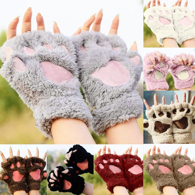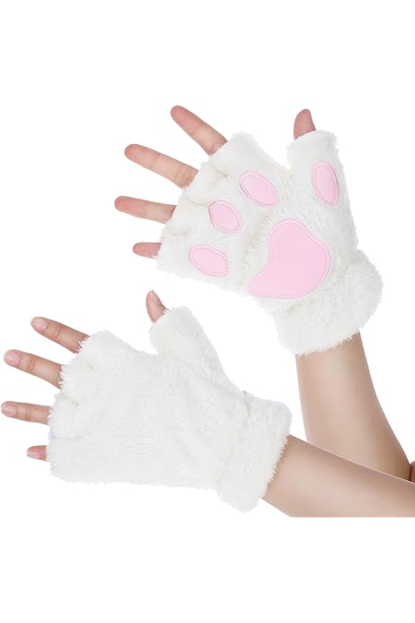 Tyqour Cat Paws - Guanti Senza Dita Per Donne, Ragazze, Bambini, Invernali, Guanti Di Peluche Spessi, Guanti Per Gatti E Gatti, Bianco, 19 X 14cm