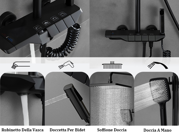 Set Doccia Termostatica: il corpo principale ha un design con blocco di sicurezza a 38° per evitare sbalzi improvvisi della temperatura dell'acqua, in grado di proteggere bene voi e la vostra famiglia, prevenire le ustioni e garantire la sicurezza. SHANFO Cromato Colonna Doccia con Miscelatore Comodo controllo:Soffione Doccia a Pioggia/doccetta/inferiore possono essere commutati liberamente. Materiale di alta qualità: il corpo del rubinetto è realizzato in materiale di ottone di alta qualità. necessari per l'installazione sono inclusi nella confezione. Servizio post-vendita: Forniamo un buon servizio post-vendita, se avete domande sui nostri prodotti, vi preghiamo di contattarci. Doccetta a quattro funzioni: potente modalità spray, che ti consente di sperimentare la funzione di pulizia che ti offre mentre ti godi il bagno. Maggiori dettagli Design del pomello La temperatura originale del termostato è di 38°, una temperatura confortevole. Tubo doccia da 150 cm L'involucro è realizzato in robusto acciaio inox 304. L'interno è realizzato in morbido materiale siliconico e giunti in rame per garantire un effetto doccia confortevole. Grandi dimensioni: soffione rettangolare 30*19CM, che permette di godere dell'effetto doccia come se fosse una pioggia. soffione doccia multifunzionale È dotato di quattro tipi di uscita dell'acqua. Una temperatura costante di 38°C è la giusta temperatura per la nostra pelle. sia il soffione che la doccetta sono dotati di ugelli in silicone, basta impastare delicatamente l'ugello con le dita per pulire efficacemente gli accumuli di calcare. doccia metaform ponte soffione acciaio doccetta Facile da pulire Utilizzando particelle di gel di silice di alta qualità, non è facile che si ingialliscano e invecchino. Impianto Doccia OCEAN ITALY Colonna Doccia Con Miscelatore Termostatico Colonna Doccia Semplice Colonna Doccia Nero: Questo set doccia con uscita d'acqua inferiore regolabile, quando la vasca da bagno o il secchio hanno bisogno di acqua, non è necessario mettere giù la doccia portatile, l'uscita d'acqua inferiore può rapidamente riempire con acqua. Distanza tra i tubi dell'acqua calda e fredda: 13-17 cm regolabile. Descrizione prodotto Design dello scarico inferiore Quando è necessario utilizzare un secchio o una vasca da bagno per riempire l'acqua, non è necessario appoggiare la doccetta, basta aprire la parte inferiore dell'uscita dell'acqua per riempirla rapidamente d'acqua, offrendoti un'esperienza semplice e conveniente.