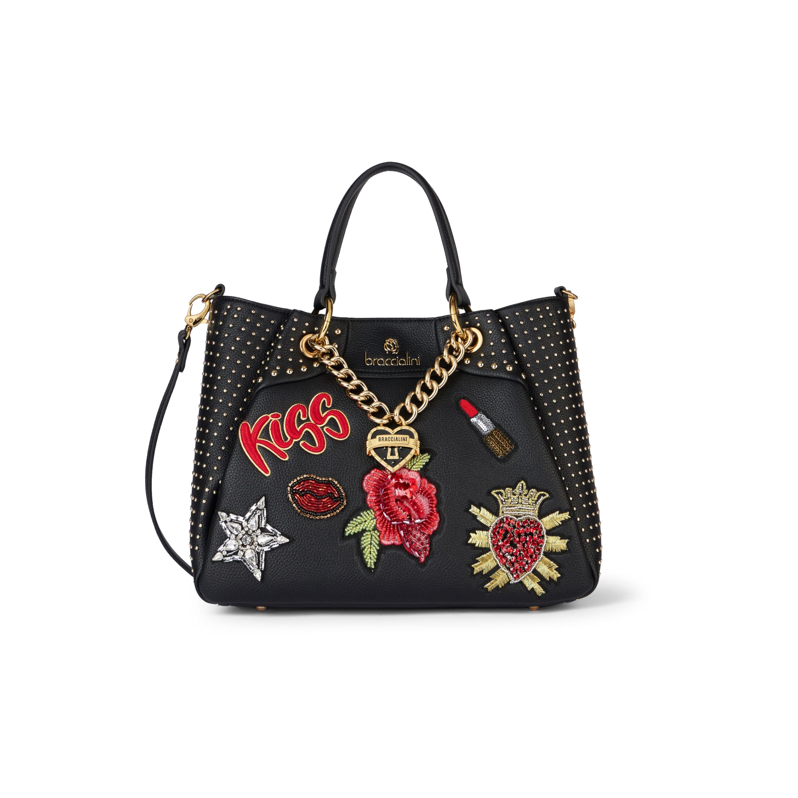 Le due tasche interne permettono di organizzare al meglio i tuoi oggetti personali, come portafoglio, cellulare, chiavi e trucchi, mantenendo tutto in ordine. La borsa a mano donna della Linea Rock è il perfetto equilibrio tra eleganza, raffinatezza e un tocco di grinta, ideale per chi vuole osare senza rinunciare alla classe. Borsa Braccialini Rock Braccialini Borsa A Mano Da Donna Marchio, Modello Cartoline B17084YY, Realizzato In Pelle Sintetica. Multicolore Borsa Donna Design Esclusivo e Rock: La borsa donna firmata Braccialini della Linea Rock è un vero e proprio tributo alla moda rock-chic. Con patch ricamati, applicazioni in paillettes e una cascata di micro borchiette dorate, questa borsa a mano donna si distingue p La maxi catena con ciondolo a forma di cuore, simbolo del brand, conferisce alla borsa un tocco esclusivo che la rende perfetta per chi ama indossare accessori con personalità e carattere. Versatilità di Utilizzo: La borsa donna firmata Braccialini della Linea Rock è dotata di due manici a mano, perfetti per un look elegante e sofisticato. Ogni elemento è stato pensato per enfatizzare lo stile e la personalità di chi la indossa. Perfetta per l’uso quotidiano, senza rinunciare al look esclusivo che solo un accessorio firmato Braccialini può offrire. Inoltre, la tracolla rimovibile offre la possibilità di indossarla anche a spalla o a tracolla, adattandosi così alle tue esigenze quotidiane. Perfetta per passare facilmente dal look da giorno a quello da sera, aggiungendo un tocco di classe in ogni occasione. Tipo di chiusura : ZipFodera : Tessuto Capienza e Organizzazione Ottimali: Con dimensioni di 32 x 22 x 15 cm, questa borsa a mano donna offre una capacità ideale per contenere tutto ciò di cui hai bisogno durante la giornata. La morbida texture e la solidità dei materiali garantiscono che questa borsetta donna resti intatta nel tempo, pur mantenendo il suo aspetto elegante e sofisticato. Materiali di Alta Qualità: Realizzata in materiale sintetico di alta qualità, questa borsa donna offre un’ottima combinazione di resistenza e stile.