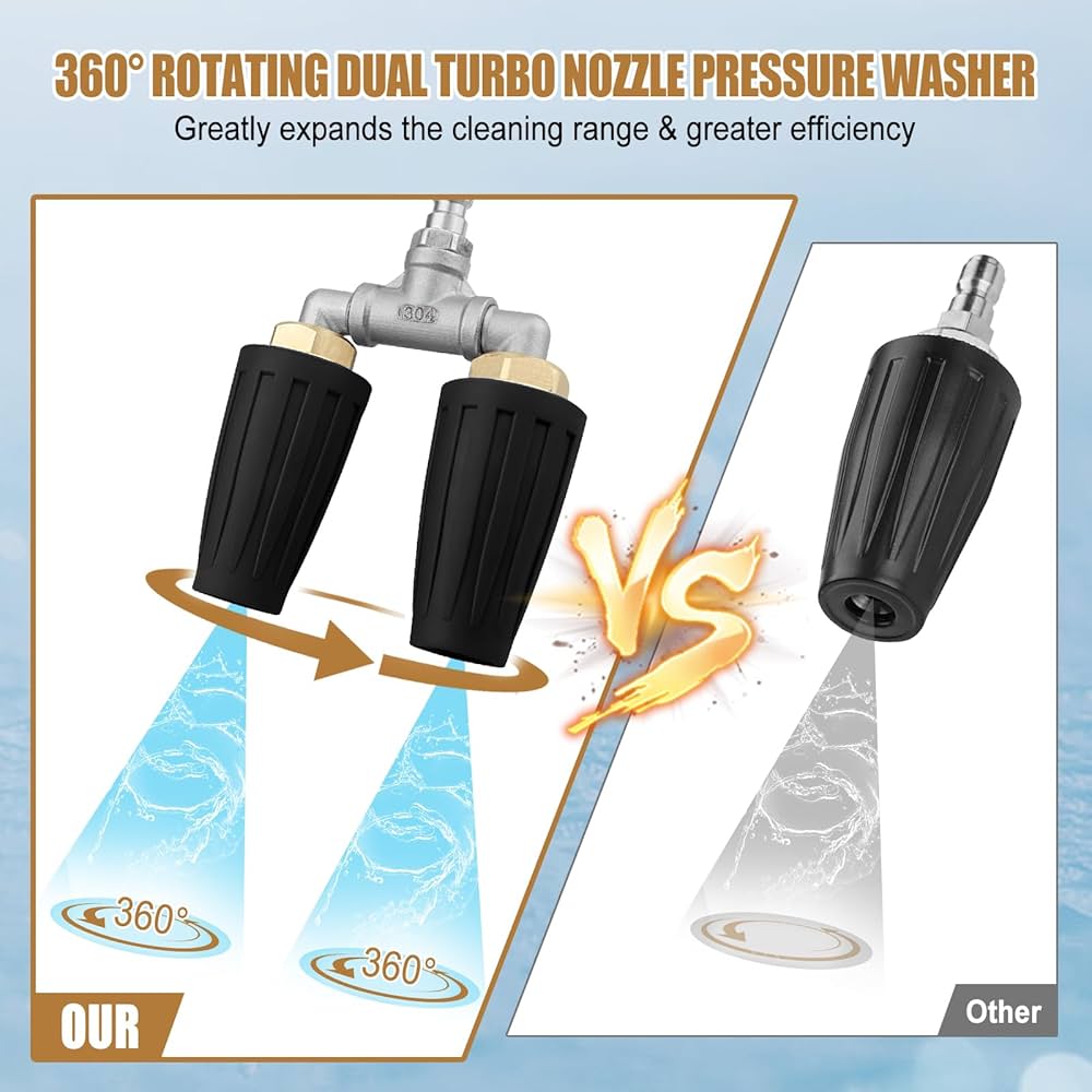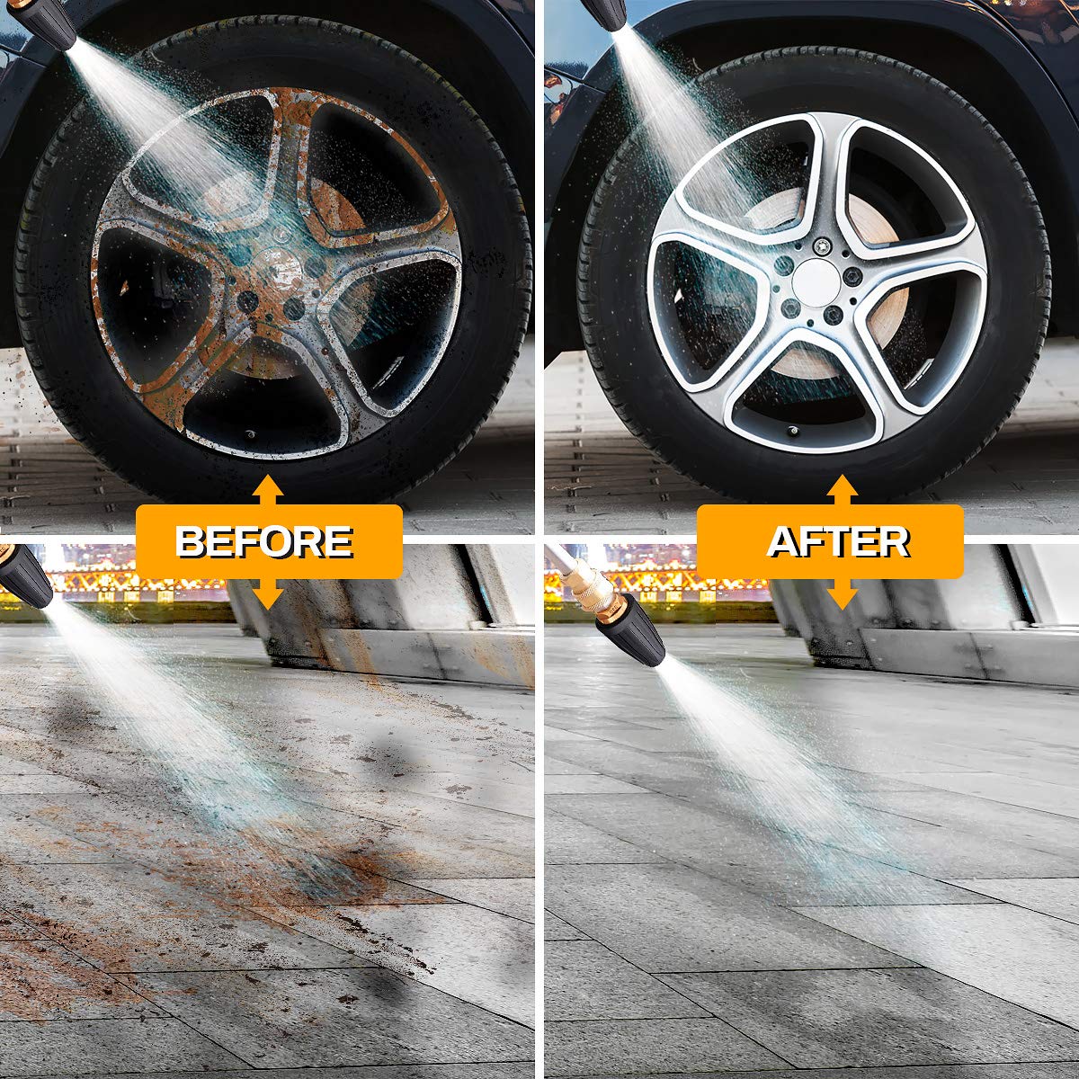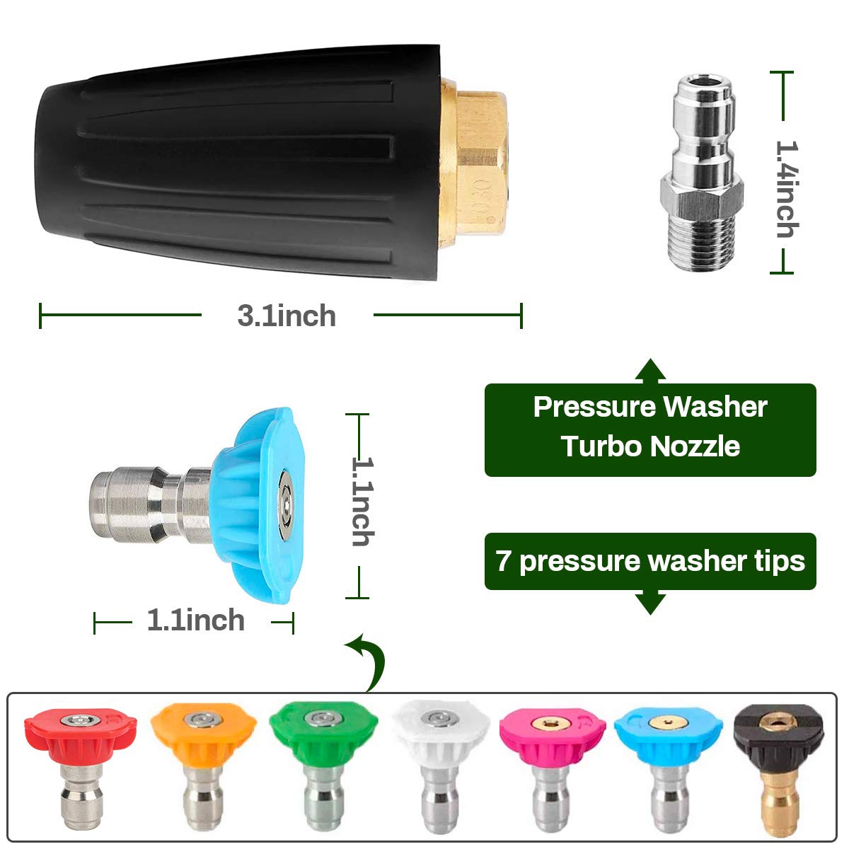 Può anche essere usato per innaffiare i fiori. Qualsiasi problema non esitate a contattarci al più presto tramite Amazon Email System e faremo del nostro meglio per servirvi. I nostri prodotti sono stati testati bene prima della consegna, ma non possiamo garantire al 100% gli articoli al momento della consegna. Portata e precisione elevate. NOTA: Più si avvicina alla superficie, più piccolo è il cerchio e più lungo è lo spruzzo. Zwini 4000PSI Idropulitrice Ugello Turbo Ugello di spruzzo 360 ° Rotante 1/4 '' Connessione Rapida con 7 ugelli ugello Kit Kit Gradi Multipli (0, 15, 25, 40 Gradi, Risciacquo1, Sapone2) Consigli RoadLoo Ugello turbo rotante , Ugello Rotativo Turbo Alta Pr Può funzionare a lungo. Specifica: Rosa - Modalità sapone - getti d'acqua da urlo Blu - Modalità risciacquo - punte per urlo a getto Rosso - 0 gradi - aree che sono alte e difficili da raggiungere; fessure pulite in marciapiedi o passi carrai Giallo - 15 gradi - utilizzare su cemento, mattoni e altre superfici dure con macchie ostinate Verde - 25 gradi - uso su superfici verniciate, rivestimenti in legno, recinzioni e tosaerba Bianco - 40 gradi - utilizzare su finestre e schermi Nero - 65 gradi - usare per spruzzare saponi e detergentiCaratteristiche: Materiale: interno in ceramica resistente ed esterno in gomma. Progettato per idropulitrici ad acqua fredda. Materiale antiruggine e antiruggine: l'ugello turbo a lavaggio a pressione è realizzato con anima in ceramica resistente e gomma esterna e ottone. 1/4 design a connessione rapida, può essere collegato a una bacchetta a connessione rapida per un'applicazione più rapida. Il cappuccio dell'ugello è in ottone e il tappo è in acciaio inossidabile (stile 304). Adattatore Ugello Rotante Punte Per Dropultrce Ugello Turbo, Ugello Rotante Per Dropultrce Adattatore Ugello Turbo Rotante 7 punte in acciaio inossidabile per lavaggio a pressione, tutte possono essere utilizzate per un lungo periodo di tempo e conservazione. (rosso uno 0 °, giallo uno 15 °, verde uno 25 °, bianco uno 40 °, nero uno 65 ° 、 rosa una modalità di sapone 、 blu una modalità di risciacquo) Offrendo un getto che va oltre gli ugelli standard. Classe di idropulitrice: questo ugello turbo rotante ha un orifizio da 4,0, 4,0 GPM con una spina a connessione rapida da 1/4 di pollice per idropulitrici fino a 4000 PSI (da 1000 PSI a 4000 PSI per idropulitrici) Adatto alla maggior parte delle aste per idropulitrici.