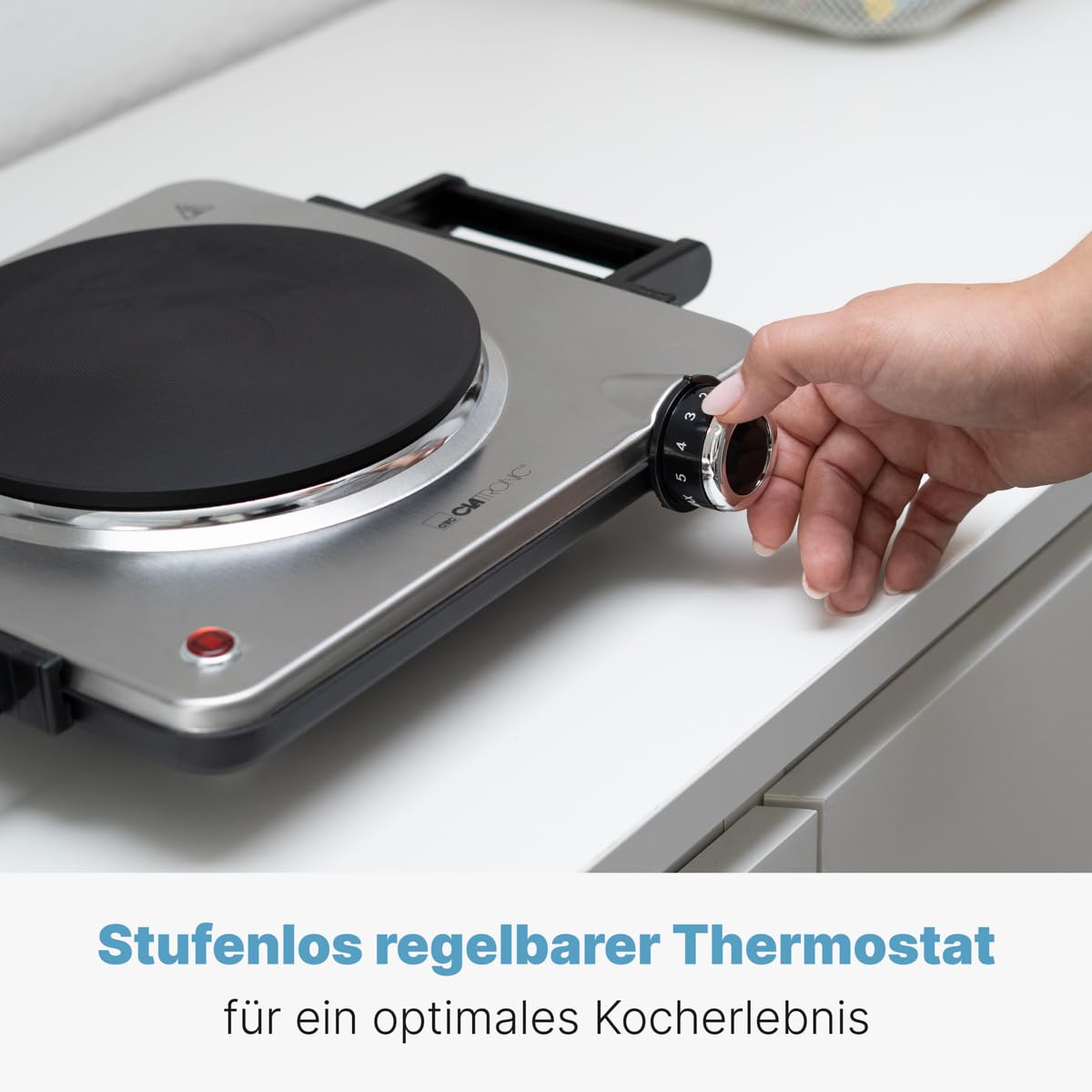 Clatronic Piano cottura mobile da 1500 W dal design compatto per campeggio, in viaggio, in ufficio o in casa con poco spazio a casa, regolazione continua della temperatura La spia della piastra riscaldante indica se il dispositivo è acceso Funzionamento sicuro del piano cottura grazie alle 2 maniglie Cool Touch montabili per un utilizzo flessibile e sicuro Piano Di Cottura Elettrico Duronic HP1SS Fornello Elettrico Da Campeggio 1500 W Piano Cottura Portatile In Acciaio Inox Con 1 Piastra Elettrica In Ghisa E Manici Per Il Trasporto Piastra Elettrica Per Grigliare Facile da usare: inserire il cavo della piastra elettrica nella presa di corrente e regolare la temperatura della piastra singola tramite una manopola a piacere La piastra di cottura è dotata di una grande piastra con diametro di circa 180 mm e offre una vasta gamma di applicazioni, ad esempio come complemento della cucina da campeggio o del fornello elettrico
