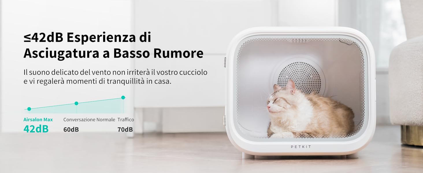 Ampio 72 litri: progettato per animali domestici di tutte le taglie, questo ampio essiccatore per cani da 72 litri offre ampio spazio per muoversi comodamente durante le sessioni di toelettatura. Funzionamento ultra silenzioso a 40 dB: il nostro essiccatore per animali domestici funziona a soli 40 dB, garantendo un'asciugatura senza stress per il tuo cane o gatto. Asciugatrice Silenziosa Aerb Fontana D'Acqua Per Gatti E Cani Di Piccola Taglia - Distributore D'Acqua Silenzioso Con Filtro A Carboni Attivi E Vassoio In Acciaio Inossidabile - Luce Notturna A LED Piccole Asciugatrici Nome del prodotto: Asciugatrice intelligente per animali domesticiModello del prodotto: asciugatrice a doppia ventolaDimensioni del'imballaggio: 54x45x48cmPeso netto: 10,2 kgPeso lordo: 11 kgPotenza nominale: 1200WFunzione aggiuntiva: 20 milioni di ioni negativiVolume: 40 decibelTensione nominale: CA 220 VAmbiente di lavoro: 16-45 °CVolume e velocità del'aria: quattro livelliPrima del'uso1. Aprire innanzitutto lo sportello e utilizzarlo come cuccia per cane/gatto per consentire al tuo animale domestico di familiarizzare con l'interno della scatola di asciugatura per qualche giorno.2. Attiva la modalità Summer Cool Nest/Winter Warm Nest per consentire al tuo animale domestico di esplorare e abituarsi al suono del box di asciugatura a bassa velocità del aria.Durante l'uso1. Non perdere mai di vista il tuo animale domestico, così puoi osservarlo e sentirti subito a tuo agio;2. Si consiglia di attivare prima la modalità di asciugatura confortevole. Informazioni su WENMEEWENMEE si concentra su attrezzature di alta qualità per l'asciugatura degli animali domestici, offrendo soluzioni sicure, efficienti e silenziose, un Controllo intelligente della temperatura: l'asciugacapelli per animali domestici è dotato di un preciso controllo intelligente della temperatura (fino a 40 °C), prevenendo il surriscaldamento e garantendo un processo di asciugatura sicuro e confortevole per il tuo amico peloso Asciugacapelli automatico PETKIT per animali domestici: cani e gatti di piccola taglia. PETKIT AIRSALON Max L’Airsalon per animali domestici è stato progettato per le famiglie con più gatti/cani, e la cabina da 60 litri offre spazio e aria fresca in abbon La velocità delicata del aria e il suono delicato aiutano gli animali domestici ad adattarsi rapidamente.3. Una volta che le condizioni del cane o del gatto si sono stabilizzate, aumentare lentamente la velocità del aria o passare alla modalità di asciugatura rapida. In questo modo si accelera il tempo di asciugatura e i capelli diventano più soffici e belli. Perfetto per gatti e cani di piccola e media taglia