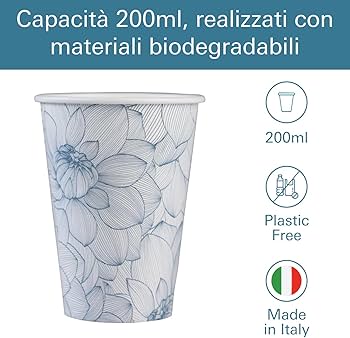 Le dimensioni di questi bicchieri sono ottimali per una varietà di usi. Bicchieri Carta Bicchieri In Carta E Flute Crystal Per Feste, Compleanni E Party Bicchieri Caffe Carta Sono l'ideale per ogni occasione, offrendo una soluzione pratica e sostenibile. Con il loro design accattivante e la loro funzionalità, questi bicchieri carta sono l'ideale per ogni occasione. MAQA Bicchiere in Carta Compostabile 200ml Plastic Free Fantasia Mare 50pz | Bicchieri di Carta per Caffè, Feste, e Compleanni | MADE IN ITALY (Fantasia Fiori Dimensioni Ottimali: Con un'altezza di 70 mm, una larghezza di 45 mm e una lunghezza di 90 mm, questi bicchieri sono ideali per servire caffè, acqua, o altre bevande. Perfetti per eventi speciali, questi bicchieri carta colorati sono l'ideale per piatti e bicchieri per feste di compleanno. Con un design fantasia mare, questi bicchieri carta aggiungono un tocco di colore e allegria a qualsiasi evento, che si tratti di una festa di compleanno o di una semplice pausa caffè. Ideali anche come bicchieri carta acqua o bicchieri caffe carta. Design Fantasia Mare: Aggiungi un tocco di colore e stile alle tue feste di compleanno con questi bicchieri carta fantasia mare. Questi bicchieri carta sono perfetti per piatti e bicchieri per feste di compleanno, aggiungendo un tocco di eleganza e praticità. La confezione da 50 pezzi è ideale per eventi speciali, feste, o per l'uso quotidiano a casa o in ufficio. I bicchieri in carta compostabile di MAQA sono progettati per essere versatili e pratici. Non dovrai più preoccuparti dell'impatto ambientale dei bicchieri plastica usa e getta, grazie a questi bicchieri compostabili che offrono una scelta ecologica senza compromettere lo stile. Bicchieri Compostabili da 200ml: Realizzati con materiali compostabili, questi bicchieri in carta sono perfetti per chi cerca un'alternativa ecologica ai bicchieri plastica usa e getta. Versatili e Pratici: Utilizzali per servire caffè, bevande fredde, o come bicchieri di carta per compleanni. Ideali per ogni occasione, questi bicchieri sono una scelta pratica e sostenibile.