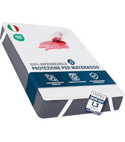 También es una excelente opción para mascotas, especialmente perros, proporcionando una protección higiénica. USO VERSÁTIL: Perfecto para el hogar y los viajes. Coprimaterasso Singolo Coprimaterasso 80x160 Impermeabile Antiacaro E Ipoallergenico Dreamzie - Certificato OEKO-TEX - Copri Materasso Con Angoli : Amazon.it: Casa E Cucina Coprimaterasso Singolo Impermeabile CERTIFICADO Y FÁCIL DE LIMPIAR: Nuestros protectores de colchón cuentan con certificación Oeko-Tex, lo que garantiza que están libres de sustancias nocivas y son seguros para bebés y niños. ALTA CALIDAD Y COMODIDAD: Fabricados con materiales duraderos y respetuosos con el medio ambiente. Se puede utilizar en camas, sofás, sillas o incluso en el asiento del coche. Se pueden lavar hasta 90 grados y son aptos para secadora, asegurando un uso higiénico y práctico. ULTRA ABSORBENTE E IMPERMEABLE: La superficie de poliéster absorbe rápidamente los líquidos, manteniendo la superficie seca y transpirable.