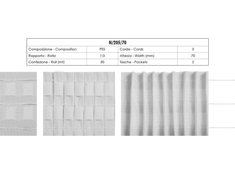 B255- rapp.1:2 - 2/T - 2/C arric. NORMALE #FNTND-11152. DETERMINATA COL. BIANCO. Rich.Preventivo. FETTUCCIA mm. 55 -art. N/205/55- rapp.1:3 - 1/T - 3/C arric Questa è la versione bianca alta 55mm È un nastro in poliestere, si presenta come una fettuccia con taschine dove inserire gli appositi gancetti a proboscide e ha due fili da tirare per l’arricciatura La fettuccia più diffusa presenta tasche per ganci e corde per arricciarsi in maniera automatica e regolare, inoltre è possibile inserire i ganci nelle tasche in molteplici posizioni Rimane inalterata nel tempo Bonprix Tende Tipi Di Fettuccia Arricciatende E Per Tende A Onda Tre Corde Multitatasche 70mm Fettuccia Per Tende Binario A Soffitto Facile da cucire, perfetta per creare tende di design in ogni ambiente della casa, si può utilizzare su tutti i tipi di tessuto leggeri, medi e pesanti