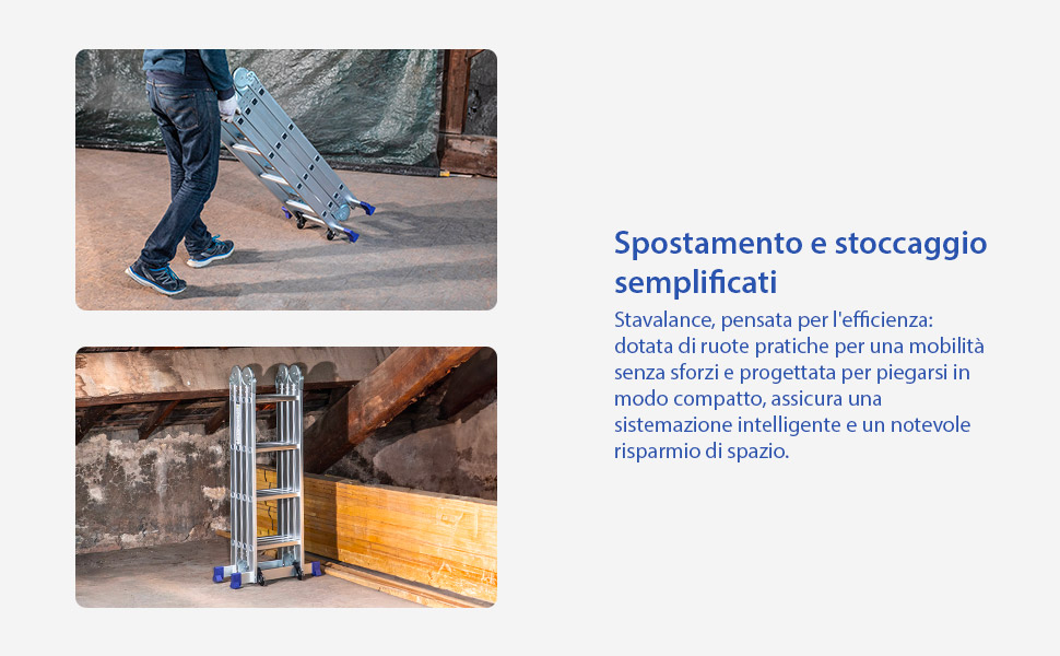 Capacità elevata della scala: Supporta un carico massimo di 150 kg, conforme alla norma EN131, perfetta per l'uso come scala dritta o sgabello. Facilità di mobilità di una scala: Dotata di ruote, questa scala pieghevole offre un trasporto e una manovrabilità semplificati, ideale per l'uso come sgabello o distanziatore di muro. Ruote per il movimento: Accessori essenziali per facilitare il trasporto e la manovrabilità della scala, rendendola più pratica per un'ampia gamma di utilizzi. Barre laterali solide e larghe: Le barre laterali di 63 x 24 mm forniscono una struttura rinforzata e una resistenza superiore, ideali per un uso come distanziatore per facciate o scala multiuso. Grandi cerniere in acciaio zincato: Ogni cerniera di 10 cm di diametro, con serrature di sicurezza, rafforza la solidità e la sicurezza della scala. Scala a pioli 4x6 da 6,04 m + 2 ripiani solo per attrezzi. - MATERIALE DI QUALITÀ: realizzato in lega di alluminio 6063 resistente alla corrosione, il cui spessore uniforme garantisce la stabilità della scala Gradini fissati tramite forgiatura a pressa: Questo metodo di fissaggio garantisce una connessione solida e duratura dei gradini, incrementando la sicurezza di questa scala versatile. Descrizione prodotto Scala pieghevole articolata STAVALANCE4x6, 6,8m, 24 gradini, multifunzione, distanziatore per muro, sgabello, in alluminio, Altezza lavoro max 7,13m Garanzia di 5 anni: la scala multifunzione Stavalance del marchio Hoström è stata progettata per durare. Le grandi cerniere di sicurezza in acciaio zincato aumentano la sua robustezza. La lega di alluminio resistente 6063/T5 è trattata con un processo di ossidazione per una maggiore durata. Vantaggi: Flessibilità eccezionale: Grazie al suo design ingegnoso, Stavalance può essere utilizzata come scala dritta, sgabello, o distanziatore per facciate, offrendo una polivalenza notevole. Gradino Pieghevole Scala Pieghevole Articolata E Telescopica In Alluminio 4x6 Gradini 6 Scala 6 Gradini Struttura e fissaggio solidi: Traverse laterali robuste e larghe di 63 x 24 mm per una maggiore resistenza delle scale. ), sicura grazie ai lucchetti di sicurezza. I gradini sono fissati alla scala tramite forgiatura a pressa, offrendo una solidità senza pari per scale e sgabelli.