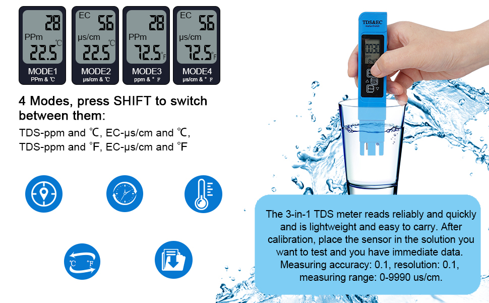 Una volta che l'indicatore si stabilizza (10-30 secondi), premere il pulsante Hold per vedere fuori dall'acqua. 4. Premere nuovamente il pulsante ON/OFF per spegnere il tester. Tds tester di acqua ideale per controllare il valore del pH dell'acqua potabile, test acqua acquario, delle piscine, degli acquari, delle colture idroponiche, dei laboratori, dell'acqua di rubinetto, ecc. Dotato di compensazione automatica della temperatura (ATC) per garantire letture accurate a diverse temperature. Conoscere la qualità dell'acqua, precisione, più veloce, Può essere utilizzato per testare l'acqua potabile, idroponica o l'acqua dell'acquario pieno. Test durezza acqua 3 in 1 Design] Il tester di qualità dell'acqua è composto da un misuratore TDS, un misuratore EC e un misuratore di temperatura.Conoscere la qualità dell'acqua, precisione, più veloce, Può essere utilizzato per testare l'acqua potabil Il tester si spegne automaticamente dopo 5 minuti di non utilizzo. 5. Dopo l'uso, scuotere l'acqua dal tester o pulirlo con un panno per la pulizia e poi rimettere il tappo protettivo. 💦【Display LCD, conversione di modalità】Il kit misuratore TDS è comodo da usare, e basta immergere il tester TDS. Contalitri Acqua Aieibuy Tester TDS EC 3 In 1 Tester Digitale Della Qualità Acqua E Misuratore Di Temperatura Per Acquari Di Acqua Potabile Piscina Spa Contatore Acqua Il tester compensa automaticamente le fluttuazioni di temperatura. Premere il pulsante SHIFT per passare dalla modalità TDS/EC alla modalità Celsius/Fahrenheit. 💦【TDS meter Comodo da usare】Premere l'interruttore e immergere la penna di prova nell'acqua da testare. 💦【Test durezza acqua 3 in 1 Design】 Il tester di qualità dell'acqua è composto da un misuratore TDS, un misuratore EC e un misuratore di temperatura. Più basso è il valore TDS, minore è il livello di solidi disciolti nell'acqua e più pura è l'acqua. Tds Misuratore per acqua potabile Specificazione Quantità: 1 pezzo Colore: bianco Materiale: ABS Batteria: Cr2032 Tensione: 3 V Barre: 2,3 mA Peso netto: 55 g Dimensioni: 155 x 30 x 14 mm Tester acqua potabile È un accessorio ideale per l'acqua potabile, le piscine, gli acquari, le piscine, le spa o i laboratori.