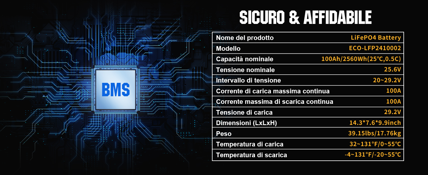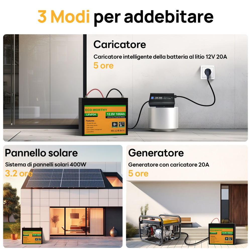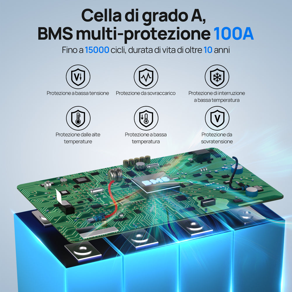 Lifepo4 Eco Worthy ECO-WORTHY LiFePO4 Batteria Al Litio 48 V 100 Ah Bluetooth Eco Worthy Lithium Phosphate Battery Le batterie al litio da 48v 100ah sono perfettamente compatibili con gli armadi standard 3U e possono essere montate in verticale per massimizzare lo spazio. litio batteria lifepo4 disponibile ah colore solare campeggio Con un peso di soli 43 kg, il lifepo4 è facile da usare da una sola persona e può essere utilizzato con un massimo di 15 batterie in parallelo per un sistema solare completo. Protezione multipla: questa batteria Bluetooth 48V 100AH LiFePO4 offre diversi livelli di protezione in un robusto alloggiamento interamente in metallo. Supporta 15P, energia massima Energia 76800Wh: La batteria ECO-WORTHY 48V 100Ah LiFePO4 fino a 15 paralleli, forma un sistema di 51,2V 1500Ah, può fornire un massimo di 76800Wh di accumulo di energia, il supporto di potenza stabile per lo stoccaggio domestico, il sistema solare del giardino, il sistema solare completo. SISTEMA DI GESTIONE DELLA BATTERIA ECO-WORTHY LiFePO4 100Ah Bluetooth con protezione da bassa temperatura, sovratensione o sottotensione, sovracorrente, alta temperatura o cortocircuito, che interrompe il processo di carica e previene i danni alla batteria LiFePO4 quando la temperatura di carica è inferiore a 0°C. Funzione Bluetooth e protezione dalle basse temperature: la batteria ECO-WORTHY 48V 100Ah LiFePO4 è dotata di funzione Bluetooth, che consente di visualizzare i vari dati della batteria (SOC) in tempo reale tramite l'APP “ECO-WORTHY”, come tensione, corrente e capacità della batteria in qualsiasi momento.
