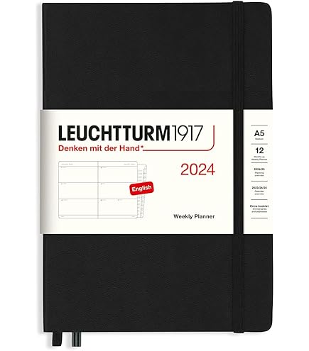 LEUCHTTURM1917 370660 Agenda Settimanale E Taccuino 2025, Formato A5, Copertina Rigida, Agenda Da 12 Mesi, Colore: Nero, Inglese