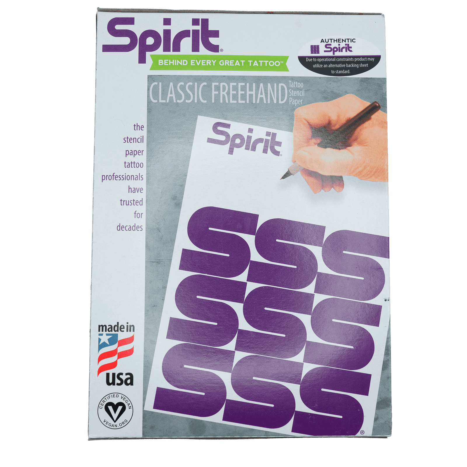 La carta per stencil Spirit® Freehand è progettata per pezzi unici. Tinta viola ad alta visibilità miscelata con una cera unica. Questa miscela di cera è liscia ed estremamente reattiva alla pressione, che permette agli artisti di inserire molti dettagli Carta Stencil Tattoo Carta Ectografica Verde Manuale Spirit Reprofx - 10-25-100 Fogli Carta Trasferimento Stencil Spirit Stencil nitidi e duraturi Risma da 25 fogli