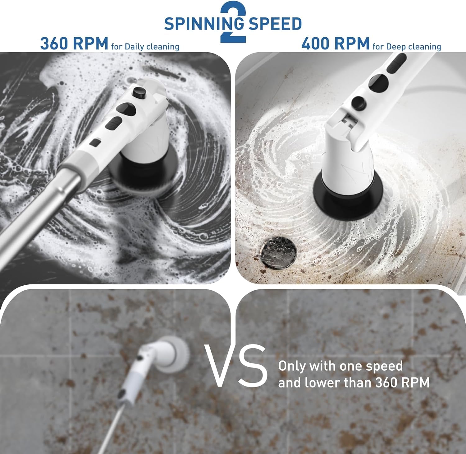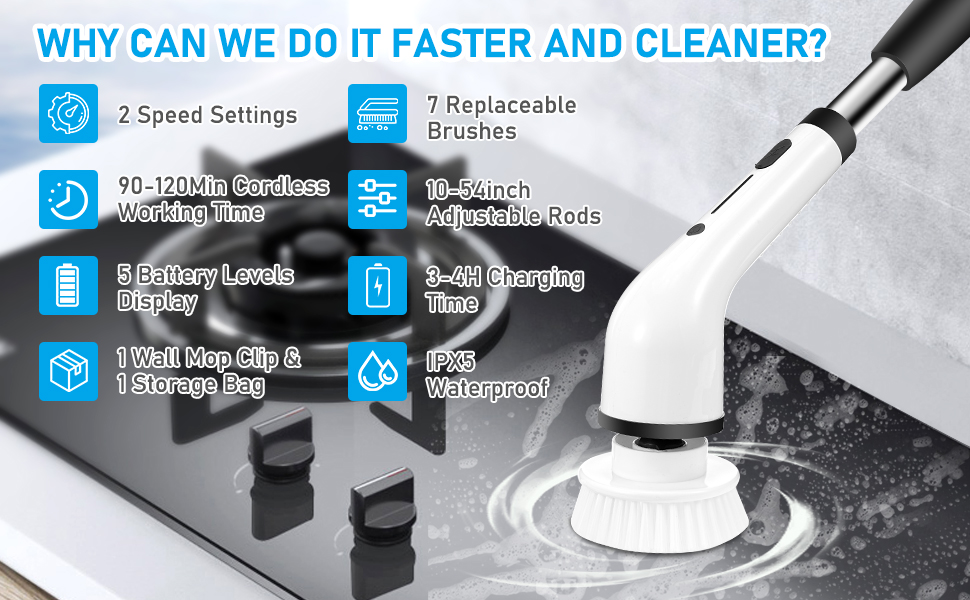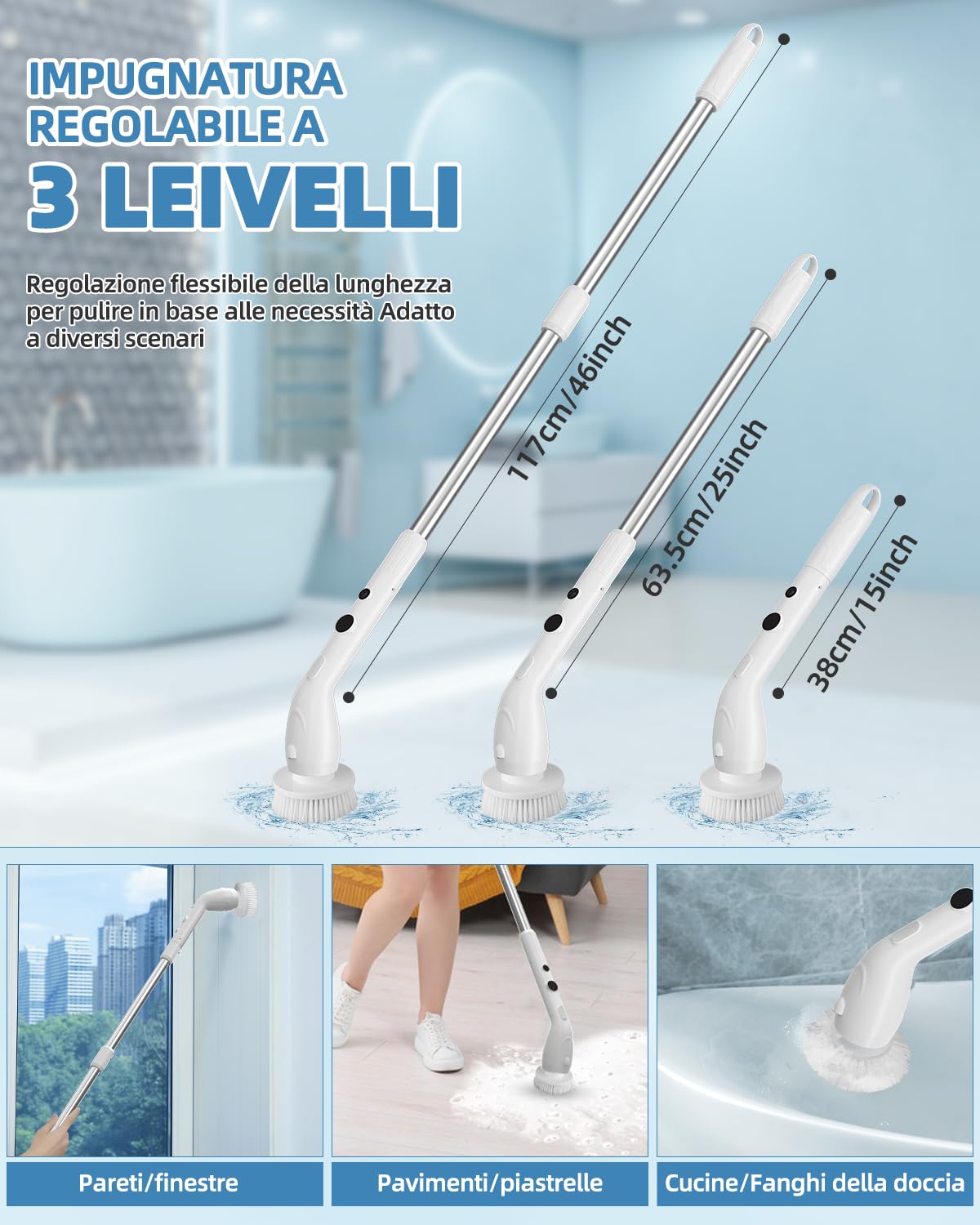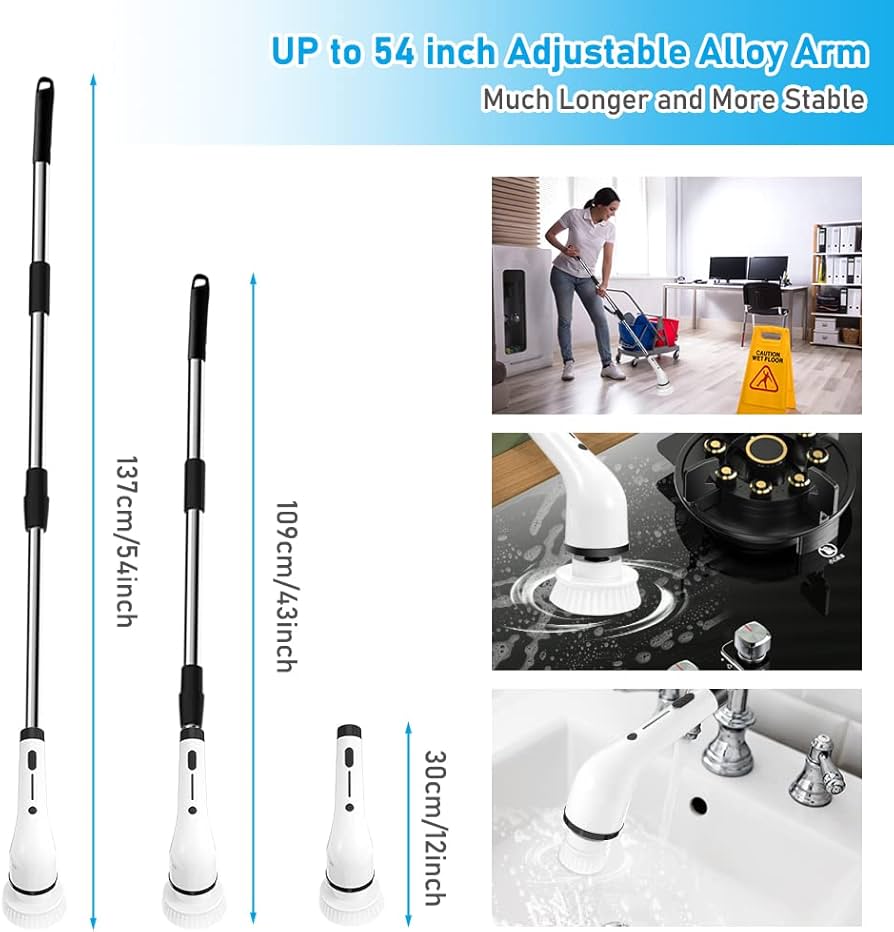 Usa questa spazzola rotante per pulizie e impermeabile per muoverti liberamente dal bagno al soggiorno e alla cucina, per pulire facilmente tutta la casa. Dì addio alla pulizia tradizionale e goditi la comodità della scienza. 【8 in 1 Spazzola per Pulizia Elettrica Potenziata】Questa spazzola rotante pulizia casa è stata completamente aggiornata in termini capacità della batteria, impermeabilità, velocità e accessori. 2 velocità (400/360 giri/min); maniglia rimovibile retrattile, intervallo lunghezza 33-142cm; display LED; 8 testine sostituibili; impermeabile IPX7; porta ricarica tipo C; tempo funzionamento 150 minuti. Nota: non immergere il motore nell'acqua. Questo è un regalo ideale per la famiglia, i genitori e gli amici. 【8 Testine Multifunzionali e Impermeabilità IPX7】La spazzola pulizia casa fornisce 8 testine intercambiabili, perfetto per la pulisci le aree incassate vasche da bagno e lavandini, aree strette come angoli e fessure, nonché pavimenti, vetro, pareti piastrellate, superfici dell'auto e altro ancora. Il spazzola elettrica presenta adotta design altamente sigillato con un impermeabilità IPX7, non è necessario preoccuparsi delle infiltrazioni d'acqua. Allo stesso tempo, la testina può essere regolata su più angolazioni (90°, 135°, 180°), liberandoti dai noiosi lavori domestici, aiutandoti svolgere i lavori domestici nella postura più rilassata. Spazzola Elettrica Senza Fili Rotante Spazzola Elettrica Per La Pulizia Con 9 Testine Sostituibili Per Spazzola Per Pulire Doccia Il design senza fili consente pulire con la spazzola elettrica senza essere collegata a una presa elettrica, rendendo la pulizia più sicura e comoda. 【Spazzola Elettrica con Lunghezza e Angolazione Regolabili】La spazzola elettrica per pulizia può regolare lunghezza tra 13, 33,6 e 56 pollici secondo necessità.