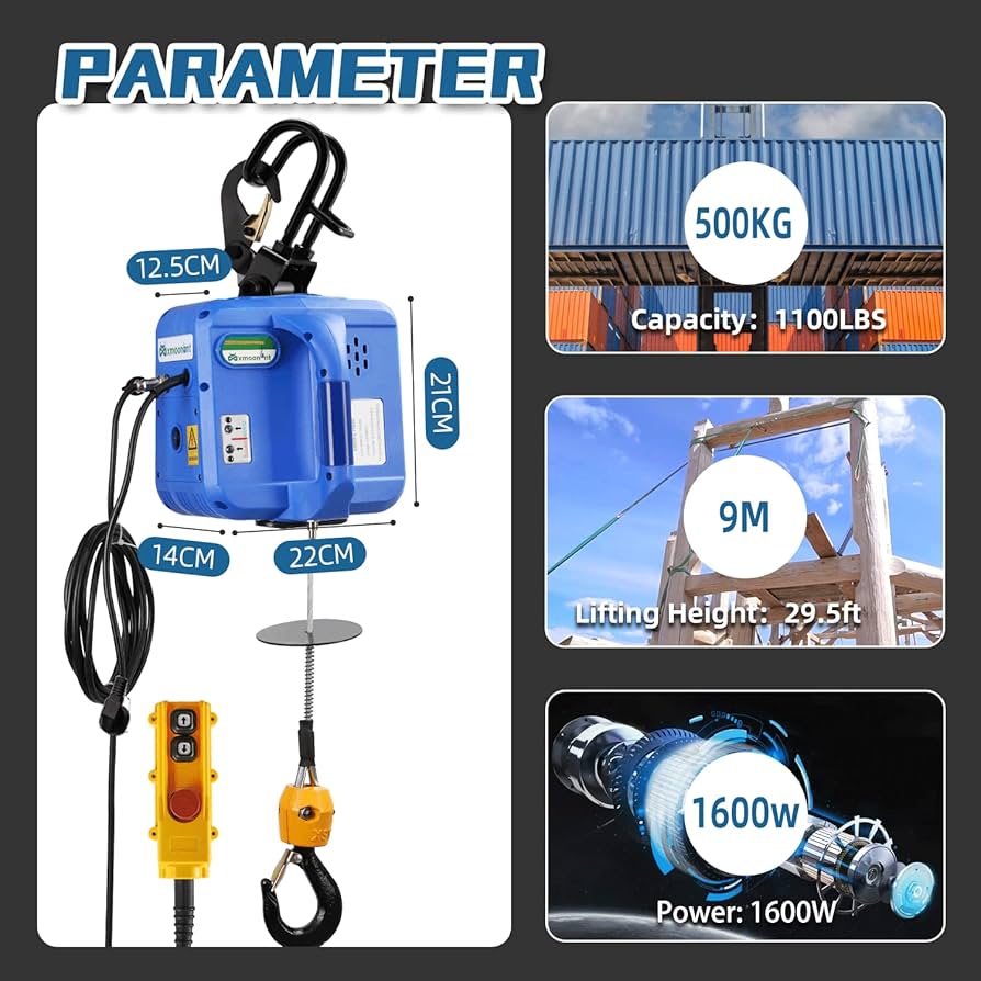 Mxmoonant 1600 W Paranco Elettrico 500 KG Con 100 M Telecomandi Senza
