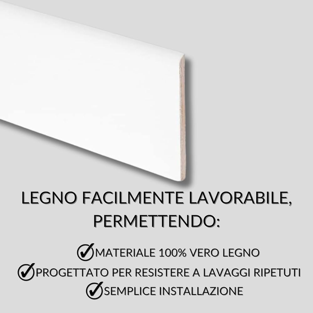 Con la sua resistenza ai lavaggi e la composizione in legno pregiato, questo battiscopa è la soluzione perfetta per completare l'arredamento della tua casa con stile. L'installazione del battiscopa è estremamente facile e veloce grazie all'utilizzo di col [SGUSCIO FRESATA]: Il design unico con sguscio nella parte bassa posteriore agevola il montaggio anche su muri non perfettamente piani. [LEGNO DI ALTA QUALITÀ]: Materiale 100% vero legno. Prodotto interamente in Italia con maestria artigianale per garantire la massima qualità. Risparmia tempo e sforzi nel processo di montaggio. Battiscopa Legno TWE Tucci Wood Essence Tanganika Per Interni Made In Italy Resistente A Lavaggi Al 100% Tinto Ciliegio Confezione X1 (10x70x2400) Mm Madia Legno [FACILITÀ DI MONTAGGIO]: Semplice e veloce da installare, anche per i meno esperti.