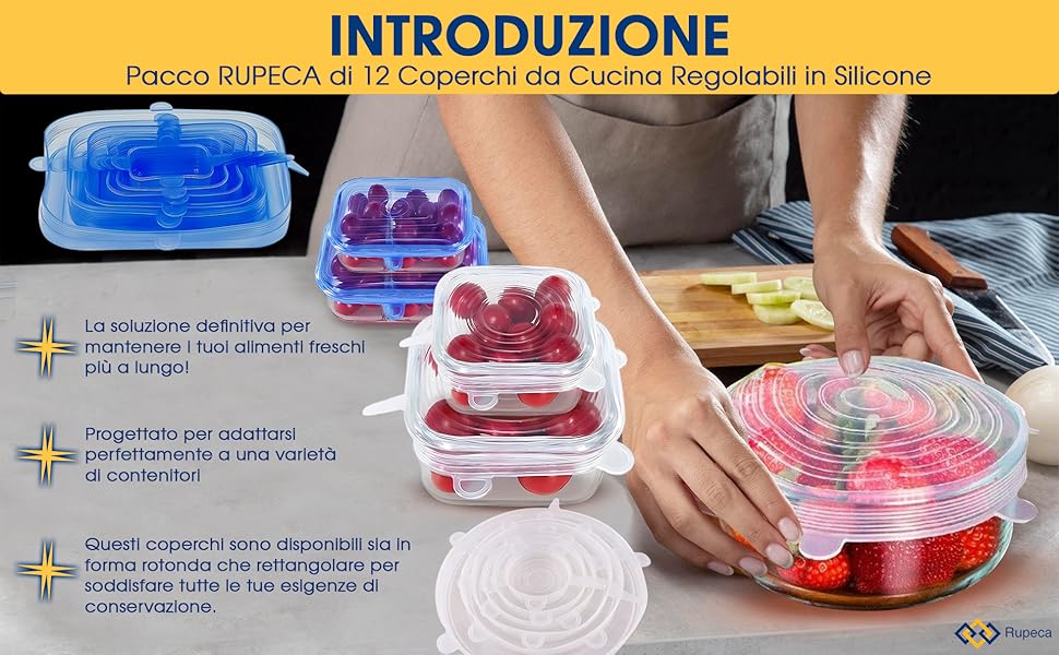 Ziyero 5 Pz Antipolvere Coperchi a Ventosa in Silicone Copri Guarnizione di Aspirazione Riutilizzabili Morbido Durevole , per Ciotole, Padelle, Piatti, Tazze, Lattine, Forni, Frigoriferi-5 Colori ... Coperchio in Silicone Estensibile 12 Pezzi USO MULTIFUNZIONALE:Coperchio Ermetico Non solo adatto alla conservazione in frigorifero, ma anche alla resistenza alle alte temperature, può essere utilizzato per il riscaldamento a microonde, per la cottura a vapore se coperto per evitare fuoriuscite di succo, è un piccolo potente aiutante per la conservazione e la cottura in cucina. che possono coprire da vicino diverse dimensioni di piatti, contenitori e frutta e verdura tagliate, per soddisfare una varietà di esigenze. Coperchio Silicone Estensibile Coperchi Silicone Estensibile Per Alimenti 12 Pezzi Coperchio Coperchi In Silicone Estensibili Dimensioni multiple:coperchio universale Fornisce un'ampia gamma di dimensioni, tra cui 18 cm, 16 cm, 14 cm, ecc. Eccellente tenuta e conservazione della freschezza:Coperchio Ermetico Il materiale elastico in silicone combinato con il design aderente può isolare efficacemente l'aria e bloccare la polvere, impedendo agli alimenti di perdere sapore, ossidarsi e deteriorarsi e prolungando la conservazione della freschezza.
