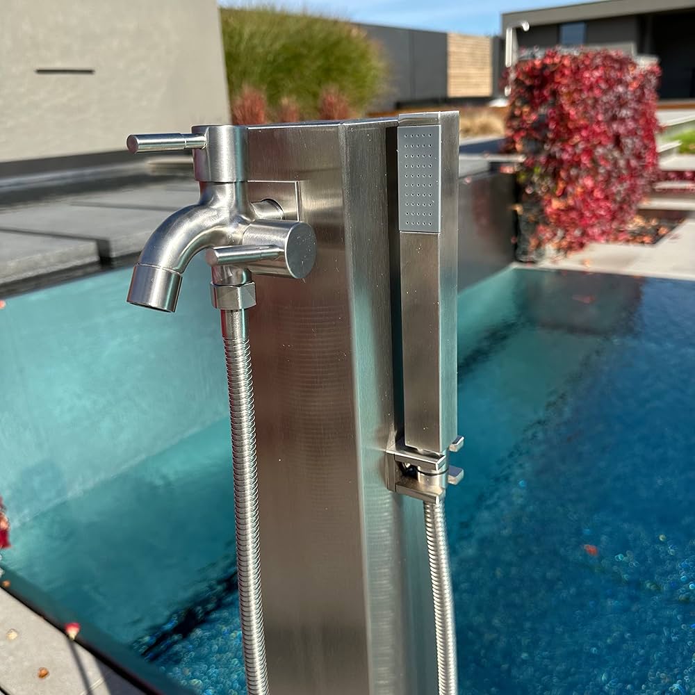 Four & More Design doccia da giardino per esterni , per piscina , doccia a pioggia , colonna doccia in acciaio inox V4A/316 spazzolato, modello Maui con attacco per acqua calda e fredda per il giardino Doccia Da Esterno MJ FABER: Colonne Doccia In Acciaio Inox 316L Per Giardino Giardino Pioggia MODELLO: scopri la massima esperienza di doccia all'aperto con la nostra doccia esterna Modello , che valorizza qualsiasi impianto esterno.