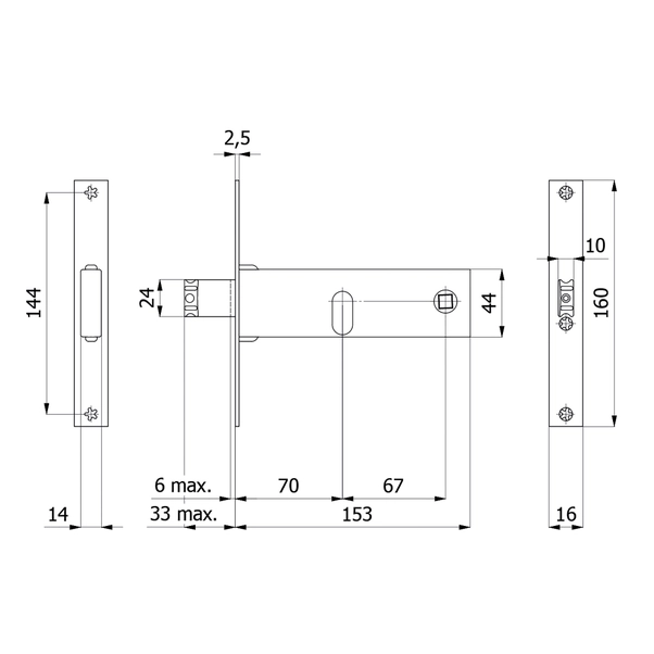 Omec 1770/f22 serratura infilare per fasce 3 mandate cilindro sagomato 70 laterale scrocco con mandata ; CHIUSURA: LATERALE ; DIM. CASSA: 153 X 78 ; INT. MAN.: 67 OMEC® 882/F22 SERRATURA PER FASCE SCROCCO + CATENACCIO CILINDRO OVALE E.80 FR.22 - Ferramenta