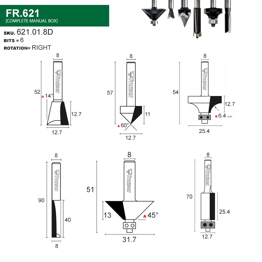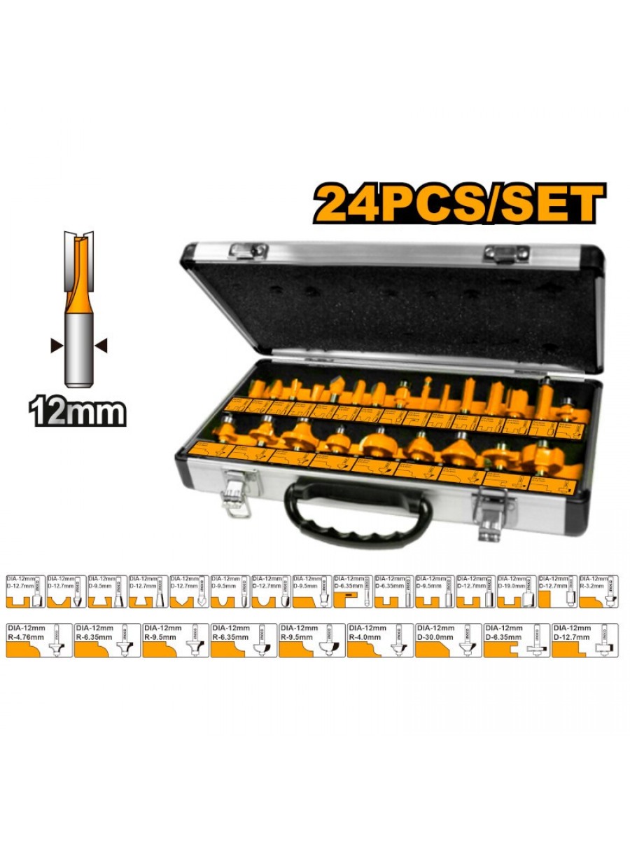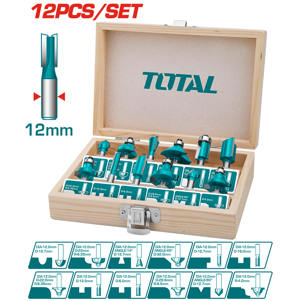Einhell SET FRESE PER FRESATRICE VERTICALE 15 PEZZI 3 frese dritte: 6mm, 12mm, 16mm SET DA 12 FRESE TOTAL CARATTERISTICHE: Frese per Fresatrice Diametro stelo 12mm IL SET INCLUDE: 3 frese dritte da 6mm,12mm,16mm 1 fresa 1/2 a 90° 1 fresa 1/2 coda di rondine 1 fresa 32mm smussatura 45° 1 fresa 1/2 per rifilatura 2 fresa tonda da 1/4 1 fresa a 90° per scanalature a V da 1/2 2 frese per arrotondamento angoli: 1/4, 3/8 1 fresa a becco di civetta R-4 1 fresa a rifilo da 1/2 1 fresa a smusso da 45° da 32mm