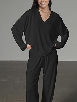 Famulily Set Pigiama Da Donna In 2 Pezzi, Con Scollo A V, Maniche Lunghe E Pantaloni Comodi A Gamba Larga, Abbigliamento Da Notte Leggero, Nero , M