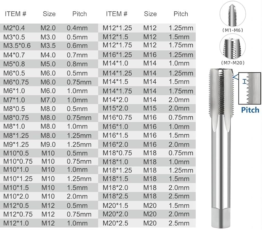La confezione include: 1 rubinetto M20 x 2,5 per mano sinistra. Suggerimenti: 1. Si prega di assicurarsi di prendere misure protettive durante il lavoro, è necessario indossare occhiali e guanti protettivi. 2. Prima di toccare confermare se il diametro del foro rotondo è appropriato. Assicurarsi di selezionare l'olio da taglio appropriato per il complesso processo di maschiatura e applicare olio antiruggine per la manutenzione dopo l'uso. 3. Quando si tocca, controllare la velocità in base alla durezza del materiale, è necessario aggiungere acqua o refrigerante per raffreddare per evitare temperature eccessive e ridurre la perdita del rubinetto. Acquista Maschio per filettatura RS PRO in HSS , M20, pezzi, passo Metrico fine 1.5mm o Maschi per filettatura su RS Online in 24 ore ti consegneremo il tuo ordine con il plus del grande servizio che solo RS può darti Materiale: acciaio ad alta velocità. Velocità di avanzamento consigliata: Acciaio duro: 5-10m/min, ghisa: 8-10m/min, acciaio ordinario: 6-15m/min. La confezione include: 1 rubinetto metrico M20 x 2,5 mm. Applicazioni: Ampiamente usato in ghisa, rame, ottone, acciaio abrasivo, acciaio A3 e altri materiali metallici per elaborare fili. Design a flauto diritto, realizzato in acciaio ad alta velocità 6542. Viene utilizzato per elaborare fili di vari fori passanti o fori ciechi poco profondi e non è possibile elaborare fori ciechi. È possibile anche l'elaborazione manuale. Può elaborare rame, ottone, acciaio A3, alluminio, ghisa e altri materiali. Burkit M20 X 2,5 Filettatura Maschio Sinistra, HSS M20 X 2,5 Dritto Maschio Macchina Filettata : Amazon.it: Fai Da Te