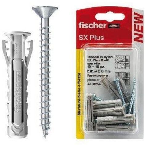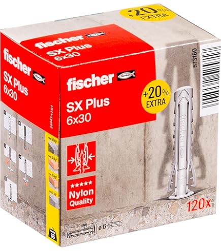 l tassello in nylon fischer SX Plus , grazie all'espansione a 4 settori, trasferisce le forze in modo ottimale nel supporto, assicurando una tenuta perfetta nei materiali da costruzione pieni e carichi elevati su tutte le murature. L'innovativ Le alette si piegano all'interno del tassello durante l'installazione, quindi la vite in posizione, grazie a questo sistema di prefissaggio delle viti, è impeccabile per applicazioni a soffitto La geometria del tassello consente di inserire facilmente nel foro di perforazione con un semplice colpo di martello, nonché una coppia di serraggio evidente, che aiuta a evitare un eccessivo serraggio della vite Fischer Tasselli Tassello In Plastica Fischer SX PLUS S Espandente ø 5x25mm Vite TSP Fisher Tasselli Grazie alla sua quadrupla espansione, la SX Plus garantisce una trasmissione ottimale delle forze nel materiale da costruzione, in particolare nei materiali pieni Imballaggio speciale: ricevi il 20% di contenuti extra GRATUITI