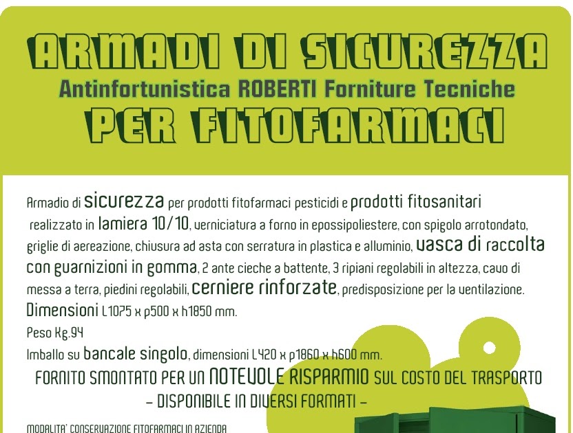 Utilizzare guanti e occhiali protettivi durante l'uso. Non fumare durante l'uso o la manutenzione del prodotto. Prometal Armadio per fitofarmaci pesticidi omologato 2A cm 100x40x179 h. Altri simili · Armadio per fitofarmaci pesticidi omologato 2A cm 100x40x179 h 22/01/2014 PIANO DI AZIONE NAZIONALE (PAN) √ Linea Guida 26/03/2015 allegate al PAN Avviso di sicurezza Attenzione: Conservare in un luogo fresco e asciutto, lontano da fonti di calore e fiamme. Lgs150/2012 del 14 Agosto 2012 √ D.M. Resistente alle sostanze chimiche, Sistema di aerazione, Vaschetta di raccolta Seguire le istruzioni del manuale dell'utente per l'installazione e la manutenzione corretta del prodotto. Descrizione prodotto mm. 400x1000x1795 (P x L x H) 3 Mensole forate (in lamiera zincata) 2 ante Vaschetta di raccolta (per sversamento accidentale, capacità 22 lt. 400x500x1795 (P x L x H) 3 Mensole forate (in lamiera zincata) 1 anta Vaschetta di raccolta (per sversamento accidentale, capacità 11 lt. Armadio Esterno Primi 5 Armadi Fitofarmaci In Italia - Maggio 2025 | 5 Armadietti Per Fitofarmaci