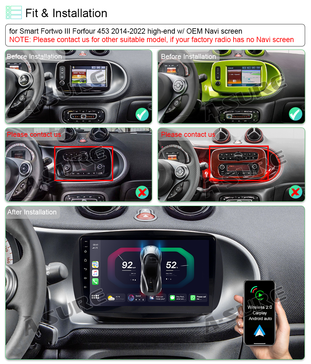 [DAB+]supporta DAB esterno (Digital Audio Broadcasting). 【Controllo del volante】Ti consente di controllare facilmente il cambio di brani, le chiamate in vivavoce, il controllo del volume, in modo più sicuro e conveniente durante la guida 【Bluetooth】Supporta BT 5.0 con chiamata A2DP/vivavoce, musica BT, download della rubrica, registro delle chiamate. 【Wi-Fi integrato】 Connettiti a Internet tramite hot spot Wi-Fi, scarica l'APP per guardare video online, ecc. 【Schermo diviso】 la possibilità di lanciare contemporaneamente due applicazioni sullo schermo. Compra MISONDA Autoradio Android 14 Doppio Din per Mercedes Benz Smart 453 Fortwo Anno 2014-2020 Fotocamera Canbus GRATUITA [6G+128G] Supporto Controllo del Volante RDS 4G WiFi DAB Carplay BT5.0. ... 4G+64G - Built-in Carplay/ Android Auto/DSP - LED Camer Goditi trasmissioni audio digitali di alta qualità che offrono una gamma più ampia di programmi radio con elevata chiarezza e senza interferenze È possibile operare su radio/musica/video durante l'utilizzo della navigazione. Autoradio Smart 453 For Mercedes Smart 453 Fortwo 2014 2020 Android 12 2din Car Autoradio Autoradio 8 Core 4g Versione Android più recente】【Dimensioni dello schermo: touchscreen IPS da 9/10 pollici】[Memoria: 4GB (RAM) + 64GB (ROM)][Risoluzione dello schermo: 1080 * 680][Chip radio: TDA7786][Potenza in uscita: 4 * 45 W][Temperatura di lavoro: -40 -80][Chip amplificatore di potenza: TDA7851]【Autoradio multifunzionale】Compatibile con FM AM, ricezione radio RDS, radio FM con 18 stazioni preimpostate. Potresti realizzare il controllo bidirezionale tra il telefono e l'autoradio puoi ottenere indicazioni stradali, effettuare chiamate, inviare messaggi e ascoltare musica, ecc. Segnale wireless Wi-Fi più stabile e velocità di trasmissione più rapida 【DSP integrato】DSP è un potente strumento che ottimizza la qualità del suono e si adatta a vari ambienti. 【Wireless Carply e Andriod Auto】collega il tuo telefono all'autoradio Android tramite BT. I percorsi adatti alla mappa online possono essere selezionati in base alle condizioni stradali in tempo reale utilizzando la mappa online.