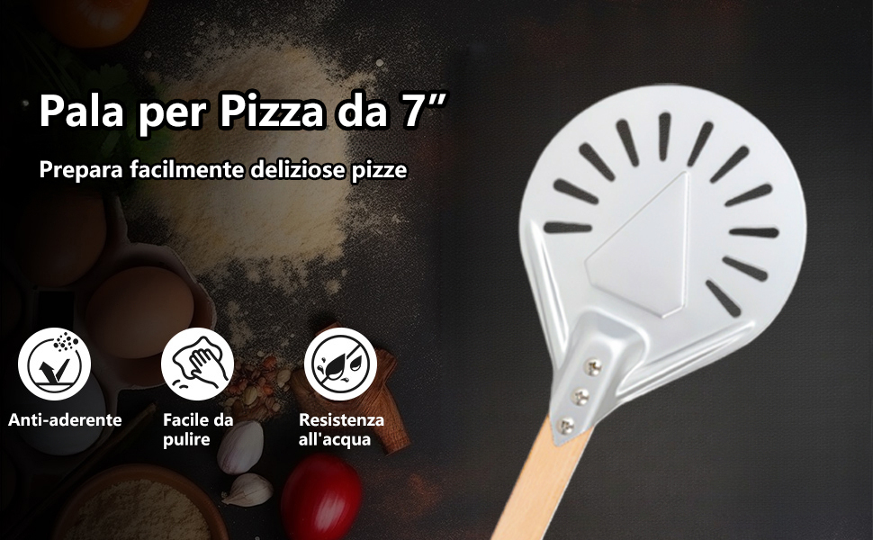 SPATOLA PER PIZZA DA 7 POLLICI: la spatola per pizza con manico in legno è realizzata in alluminio anodizzato duro di alta qualità e durata, resistente all'abrasione e al calore, protegge la superficie dall'ossidazione e dalla decomposizione e può essere riutilizzata. MANICO IN LEGNO DA 40 cm: il manico in legno robusto e resistente offre una presa confortevole e consente di trasferire facilmente la pizza dal piano di lavoro al forno; il manico è rimovibile e facile da trasportare. Magrimaxio pala per pizza forata, 7 Pollici spatola pizza in Alluminio Anodizzato Duro con Manico, pale per pizza professionale, paletta per pizza, per Pizzas, Pane, Crostate Fatta in Casa Il manico rimovibile è facile da riporre in cucina. Colore: argento Dimensioni: 7 pollici Manico: Manico in legno, rimovibile Consigli caldi: Per garantire che la pizza scivoli senza intoppi, assicurarsi di spolverare la buccia della pizza con la farina in anticipo per evitare che si attacchi. Perfetto per il catering e l'uso domestico. Adatto a tutti i prodotti da forno, torte, biscotti e persino pizze sulla griglia del forno. Spatola per pizza forata in alluminio QOUBNIC Spatola per pizza di qualità superiore, ideale per girare le pizze nel forno. Specifiche del prodotto: Materiale: alluminio anodizzato, resiste a temperature fino a 390 °C. Un regalo perfetto per gli amanti della pizza. Pala Pizza Professionale Pala Per Pizza Forata, 14 Pollici Pala Per Pizza In Alluminio Pala Pizza Forata