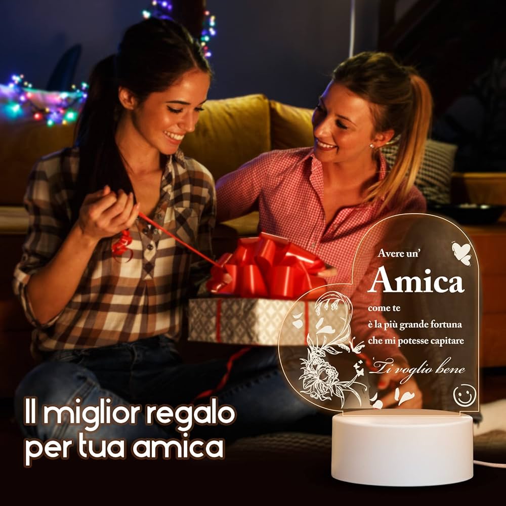 Ricevere un regalo è sempre bello, ma un regalo personalizzato è davvero speciale. Idea regalo: questa lampada è il regalo ideale per stupire in ogni occasione. Il regalo che tutti vorrebbero Puoi personalizzare la lampada con le tue foto, inserire i vostri nomi o una frase in modo da creare un prodotto unico e particolare. Che si tratti di una tazza per amica , di una t-shirt personalizzata o di una cover personalizzata , puoi personalizzare ogni dettaglio per celebrare la vostra amicizia . Con PhotoSì, creare regali personalizzati per amiche è semplice e diver Idea regalo per ogni occasione Questa lampada Stileitaliano è il regalo perfetto da fare alla tua amica del cuore e sarà sicuramente apprezzata da chi la riceverà. Base in legno con led: La lampada è realizzata con materiali di qualità, la base è in legno naturale e dotata di led multicolore che permette di scegliere la tonalità di colore preferita, Iooltre puoi regolare l'intenistà della luce dal minimo al massimo. Idee Regalo Amica Speciale Lampada Dell'amicizia Personalizzata, Luce Floreale Bestie, Se Gli Amici Fossero Fiori Sceglierei Te, Regalo Per La Migliore Amica, Regalo Per La Sorella, Regali Di Natale Per Il Signor - Etsy Italia Porta Foto Multiple Da Parete Descrizione prodotto Stileitaliano lampada personalizzabile con led multicolore in legno naturale Alimentazione con cavo Usb: Puoi collegare la lampada a qualisiasi caricabatterie con uscita Usb da 5v oppure puoi usarla con un powerbank, o magari collegarla al computer. Puoi selezionare il colore del led e la sua intensità per creare l'effetto luminoso per il tuo ambiente Lampada led Stileitaliano: Bellissima lampada in plexiglass personalizzata con base in legno. Utilizziamo materiali di qualità e finiture di pregio Dotata di cavo Usb universale e funzione di luminosità regolabile con effetti luminosi Istruzioni per personalizzare la lampada