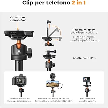K&F Concept Treppiede Smartphone E Fotocamera, Bastone Selfie 175cm MS24, Selfie Stick Con Telecomando Bluetooth E Clip Per Cellulare, Adattatore Per GoPro/DJI Action/ Insta360, Streaming E Vlogging