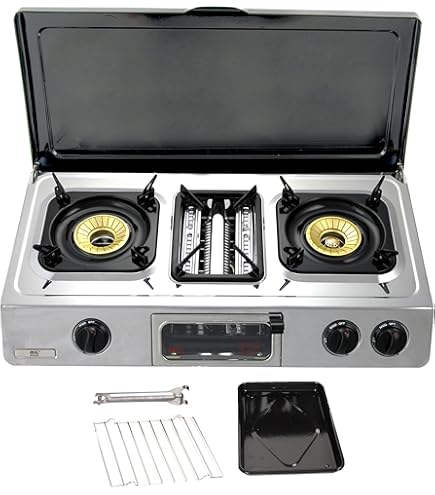 Fornello A Gas Da Campeggio Fornello 2 Fuochi A Gas Metano Per Uso Interno Valvolato In Piano Cottura 2 Fuochi Gas Fornello a gas metano a 2 fuochi, con piano in acciaio inox, coperchio e fianchi verniciati grigi, bruciatori in lega Pyral N2, spartifiamma in ottone stampato, griglia in acciaio cromato. Fornello a gas metano a 2 fuochi, con piano in acciaio inox, coperchio e fianchi verniciati grigi, bruciatori in lega Pyral N2, spartifiamma in ottone stampato, griglia in acciaio cromato Gas Metano di città Fornello a gas Metano a 2 fuochi, con piano in acciaio inox, coperchio e fianchi verniciati grigi, bruciatori in lega Pyral N2, bruciatore grill da 1,5 kW, spartifiamma in ottone, griglia in acciaio cromato, bacinella alluminata con griglia in acciaio cro Dimensioni: cm 58 x 30 x 12 - Peso: kg. 3,8