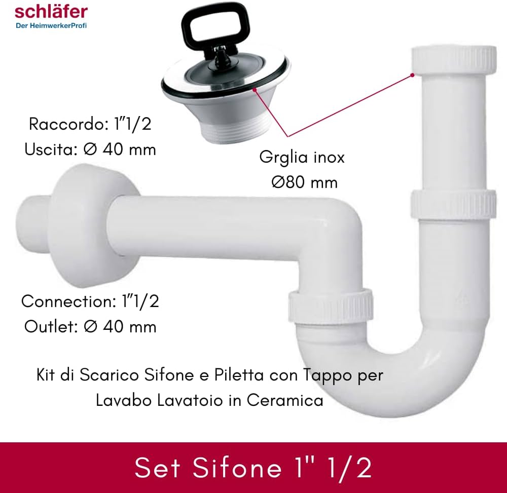 Non rinunciare alla scelta migliore per la casa al prezzo più conveniente! Perfetto per ogni installazione. Questo Set comprende : Sifone a S con Piletta scarico Lavandino con attacco universale 1 1/2″ (44 mm. La soluzione ideale per tutti i lavabi, Lavat MATERIALI: Ottima Qualità, questo praticissimo Sifone a U per lavabo è adatto tutti i lavandini e lavelli standard - Basta avvitare la parte filettata al lavandino e la parte liscia all'uscita sulla parete. ADATTO : Adatto a tutti i tipi di Lavello, Lavabo, Lavatoio in ceramica per bagno cucina e lavanderia, il Sifone di scarico a S elimina i cattivi odori in bagno e cucina. KIT SIFONE LAVELLO : Sifone per Lavello con piletta e morsetto in Gomma - Raccordo di scarico 1 1/2 - Piletta con tappo scarico Lavandino Ø Ø 80 mm - Tubo Sifone Ø 40 mm Il Sifone a S per Lavello può essere pulito in qualsiasi momento in modo semplice e veloce grazie al rapido smontaggio. Placca Geberit Schläfer 4618105 | Kit Di Scarico Con Sifone Per Lavello Universale G 1 1/2 E Piletta Con Tappo Per Lavabo, Lavatoio, Lavanderia, Raccordo Tubo | Leroy Merlin Stura Lavandini E Scarichi DIMENSIONE: Sifone Salvaspazio scarico Lavello S Attacco universale 1 1/2 - Lunghezza max tubo 250 mm - -Altezza tubo telescopico da 140 a 230 mm - NELLA CONFEZIONE : x1 Sifone Scarico Lavello - x1 Piletta Scarico Lavandino con tappo Ø 80 mm